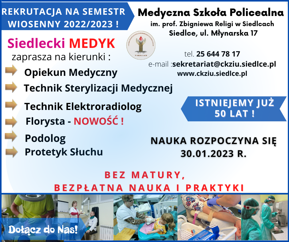 Siedlecki Medyk podąża nie tylko za rynkiem pracy, ale przede wszystkim za palącym problemem społecznym i kształci w zawodach, w których poszukiwani są specjaliści. Jako szkoła dokładamy wszelkich starań aby tę lukę kadrową wypełnić świetnie przygotowanymi, wyposażonymi w wiedzę i umiejętności praktyczne absolwentami naszej szkoły podkreśla dyrektor Urszula Łukasiewicz.