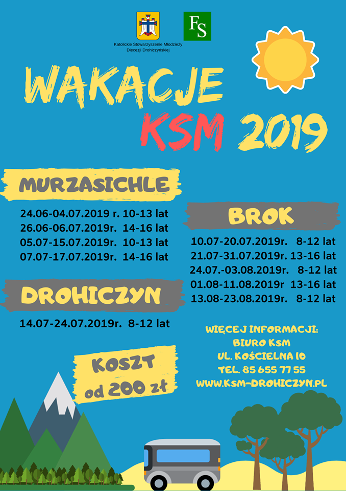 Zgłoszenia na obozy przyjmowane są w Biurze KSM DD ul. Kościelna 10, 17-312 Drohiczyn tel. 85 655 77 55 lub mail ksm@ksm-drohiczyn.pl. Dodatkowe informacje można też znaleźć na stronie www.ksm-drohiczyn.pl