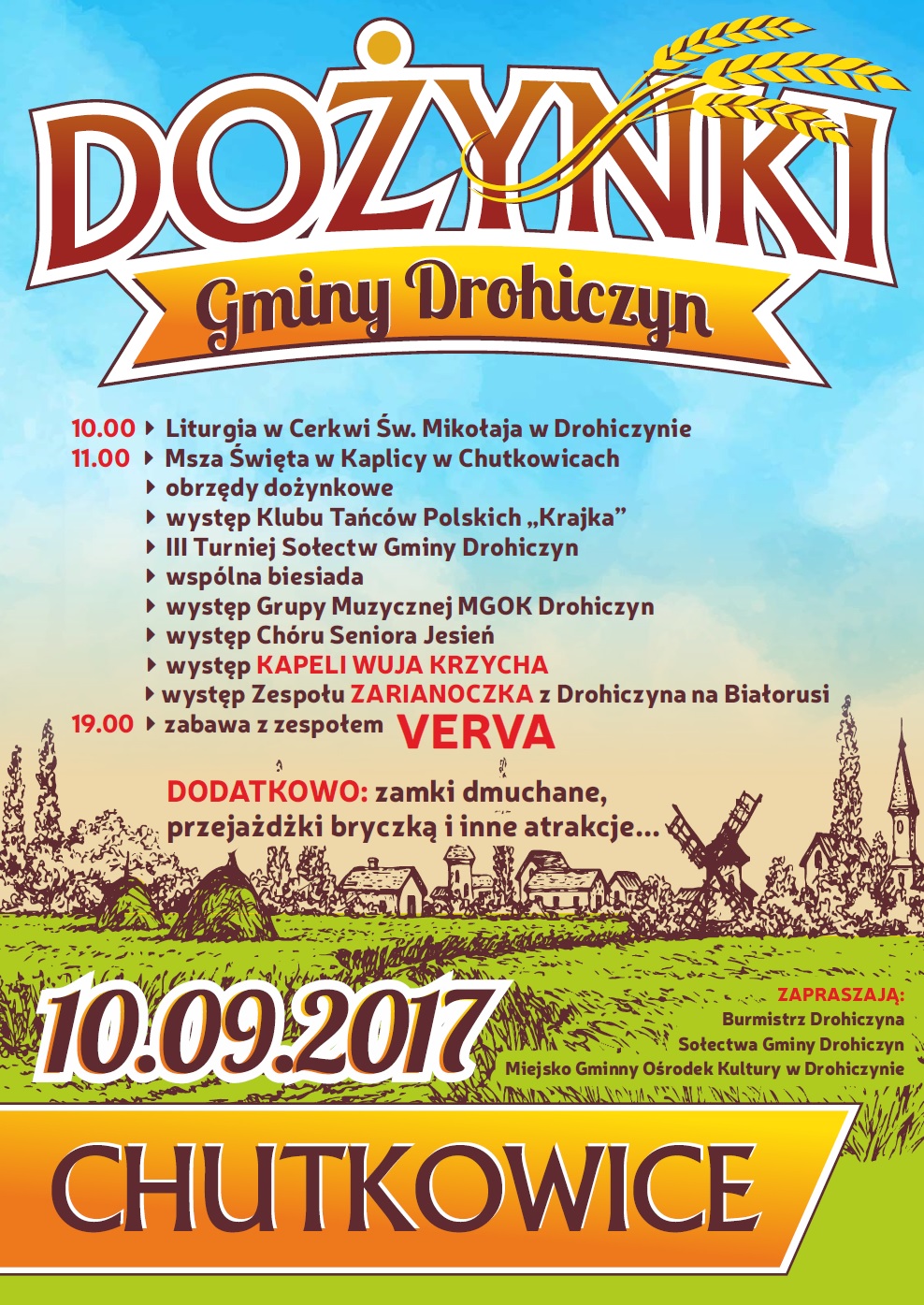 Dodatkowo przewidziano dmuchane zamki, przejażdżki bryczką i inne atrakcje. Na dożynki zaprasza Burmistrz Drohiczyna, Sołectwa Gminy Drohiczyn i Miejsko Gminny Ośrodek Kultury w Drohiczynie.