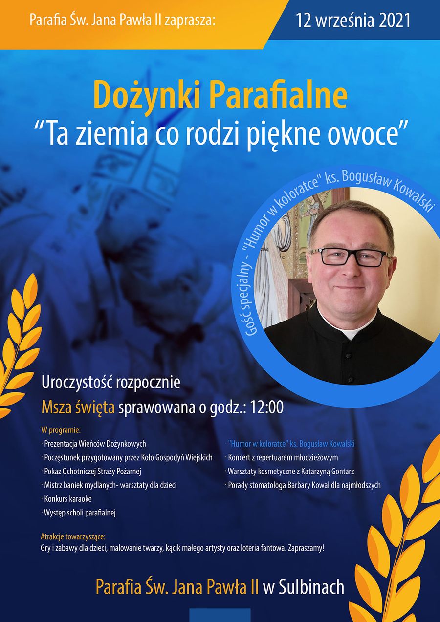Gościem specjalnym uroczystości dożynkowych będzie ks. Bogusław Kowalski jako jednoosobowy kabaret z „Humorem w koloratce” .