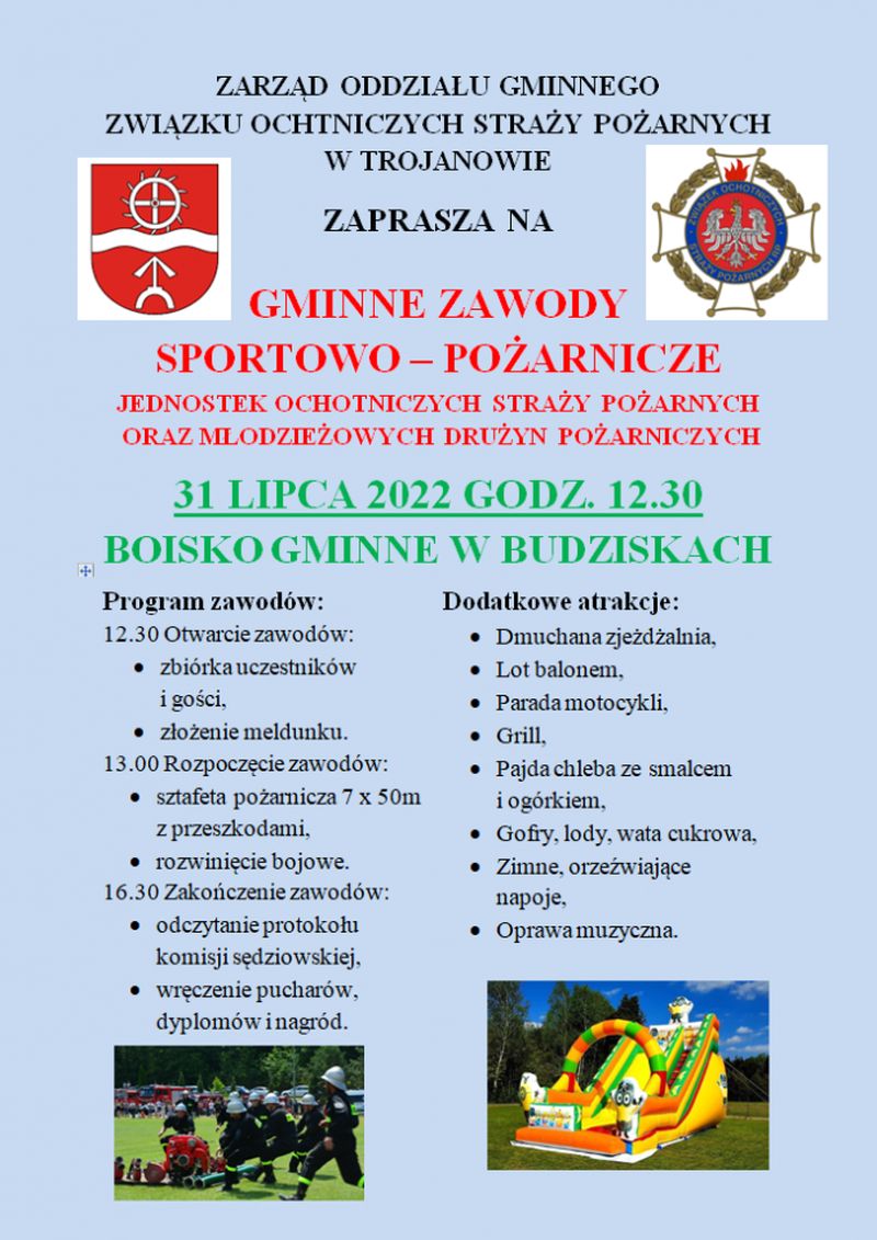 31 lipca na boisku sportowym w Budziskach odbędą się Gminne Zawody Sportowo- Pożarnicze jednostek Ochotniczych Straży Pożarnych i Młodzieżowych Drużyn Pożarniczych z terenu gminy Trojanów. Oprócz strażackiej rywalizacji, organizatorzy zaplanowali też wiele dodatkowych atrakcji.