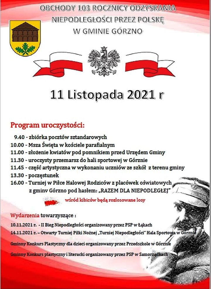 O 16:00 odbędzie się Turniej w Piłce Halowej Rodziców z placówek oświatowych z gminy Górzno pod hasłem „Razem dla Niepodległej”.