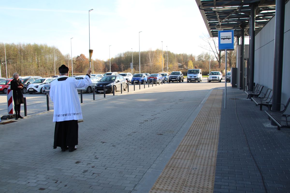 Przecięto symboliczną wstęgę oficjalnie otwierającą centrum przesiadkowe, a proboszcz parafii ks. kan. Andrzej Banasiuk obiekt poświęcił.
