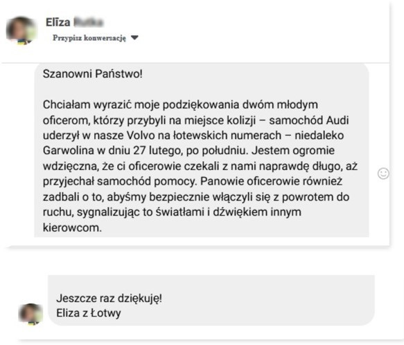 Garwolińscy policjanci z ruchu drogowego każdego dnia starają się dbać o bezpieczeństwo mieszkańców powiatu. Funkcjonariusze nigdy nie pozostają obojętni na problemy i zagrożenia, a bezpieczeństwo w ruchu drogowym to dla nich priorytet. - 27 lutego po południu patrol ruchu drogowego został wezwany na miejsce kolizji. Na trasie S17,  na wysokości Pilawy, kierujący audi wjechał w tył volvo, którym podróżowała obywatelka Łotwy. Funkcjonariusze zabezpieczyli miejsce zdarzenia, wykonali wszystkie niezbędne czynności i sporządzili potrzebną dokumentację. Sprawca zdarzenia został ukarany mandatem. Policjanci porozumiewali się z poszkodowaną obywatelką Łotwy tylko w języku angielskim. Wyjaśnili, jak dalej postępować w sprawie likwidacji szkody, a niezbędne informacje zapisali kobiecie na kartce. Z uwagi na duży ruch na trasie policjanci pomogli jej w bezpieczny sposób włączyć się do ruchu. Wdzięczna kierująca przesłała dzisiaj wiadomość z podziękowaniem za okazaną pomoc- informuje mł. asp. Małgorzata Pychner, rzecznik prasowa KPP Garwolin. -Choć to przecież codzienność w służbie policjantów ruchu drogowego, funkcjonariusze byli miło zaskoczeni gestem kobiety. Takie podziękowania są dla funkcjonariuszy bardzo przyjemne i pokazują, że nawet najprostsza pomoc może być zauważona oraz doceniona przez osoby, które były w potrzebie- dodaje funkcjonariuszka.