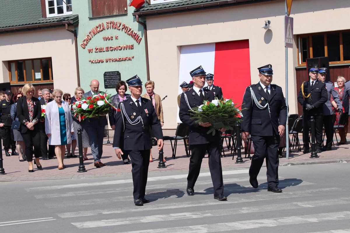 Po nabożeństwie licznie zgromadzeni uczestnicy uroczystości prowadzeni przez orkiestrę oraz poczty sztandarowe udali się ulicami miasta na plac przed Klubem Strażaka, gdzie odbyła się dalsza część obchodów. Po złożeniu meldunku przez komendanta gminnego OSP dh Jana Dziubaka, wciągnięciu na maszt flagi państwowej oraz odegraniu przez orkiestrę hymnu narodowego, głos zabrał burmistrz Żelechowa Łukasz Bogusz, który nawiązał do wydarzeń sprzed 231 lat. Złożył również życzenia strażakom z okazji ich święta. Następnie słowa do zebranych skierowali poseł Grzegorz Woźniak i przedstawiciel komendanta powiatowego PSP w Garwolinie kpt. Piotr Filipek. Uczniowie ze Szkoły Podstawowej w Stefanowie przedstawili okolicznościową część artystyczną, na którą składał się montaż słowny przeplatany utworami muzycznymi oraz tanecznymi – polonezem i układem z szarfami. W akademii nie zabrakło również życzeń i podziękowań dla strażaków ochotników. Potem goście, przedstawiciele samorządu, służb mundurowych, lokalne organizacje i stowarzyszenia oraz delegacje szkół złożyli wieńce pod Pomnikiem Konstytucji 3 Maja.