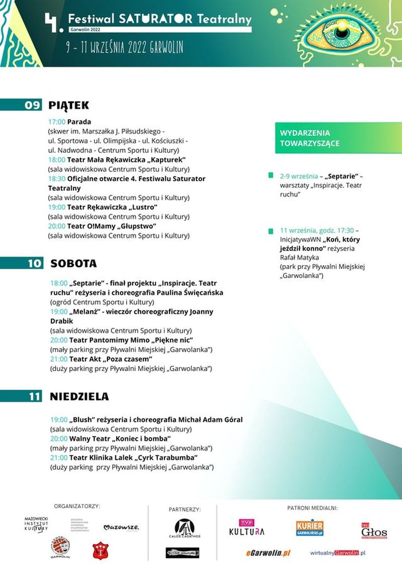 Miejsce i czas spektakli „Zaczarowany Kapturek” oraz „Cyrk sznurkowy” są takie same: park przy Pływalni Miejskiej „Garwolanka”, godzina 16:00. Pierwsze przedstawienie zobaczyć będzie można w sobotę 10 września. Czy znana bajka o Czerwonym Kapturku może jeszcze czymś zaskoczyć? Tak! Pod warunkiem, że jej wyczarowaniem zajmie się magik, sztukmistrz nad sztukmistrzami, który zaprosi widzów do niezwykłego świata baśni i teatru jednocześnie. Pojawią się: wilk, babcia, myśliwy, mama oraz Czerwony Kapturek, który jednak w niczym nie przypomina pomocnej dziewczynki znanej z opowieści Braci Grimm. Jest to przedstawienie w formie tradycyjnego teatru pacynek, w którym aktor-magik zręcznie wciela się w każdą postać, błyskawicznie zmieniając lalki na dłoniach. Barwna scenografia przenosi uczestników w różne miejsca zdarzeń, zaś muzyka nasyca spektakl ciekawymi brzmieniami.