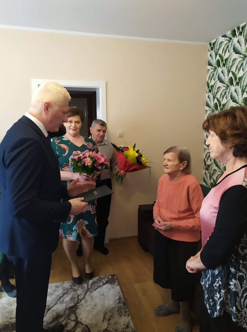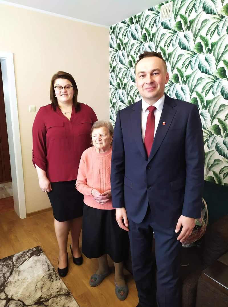 List gratulacyjny od prezes ZUS Gertrudy Uścińskiej odczytał kierownik garwolińskiego Inspektoratu Ignacy Kozak oraz wręczył jubilatce kwiaty i decyzję przyznającą dodatkowe świadczenie emerytalne.