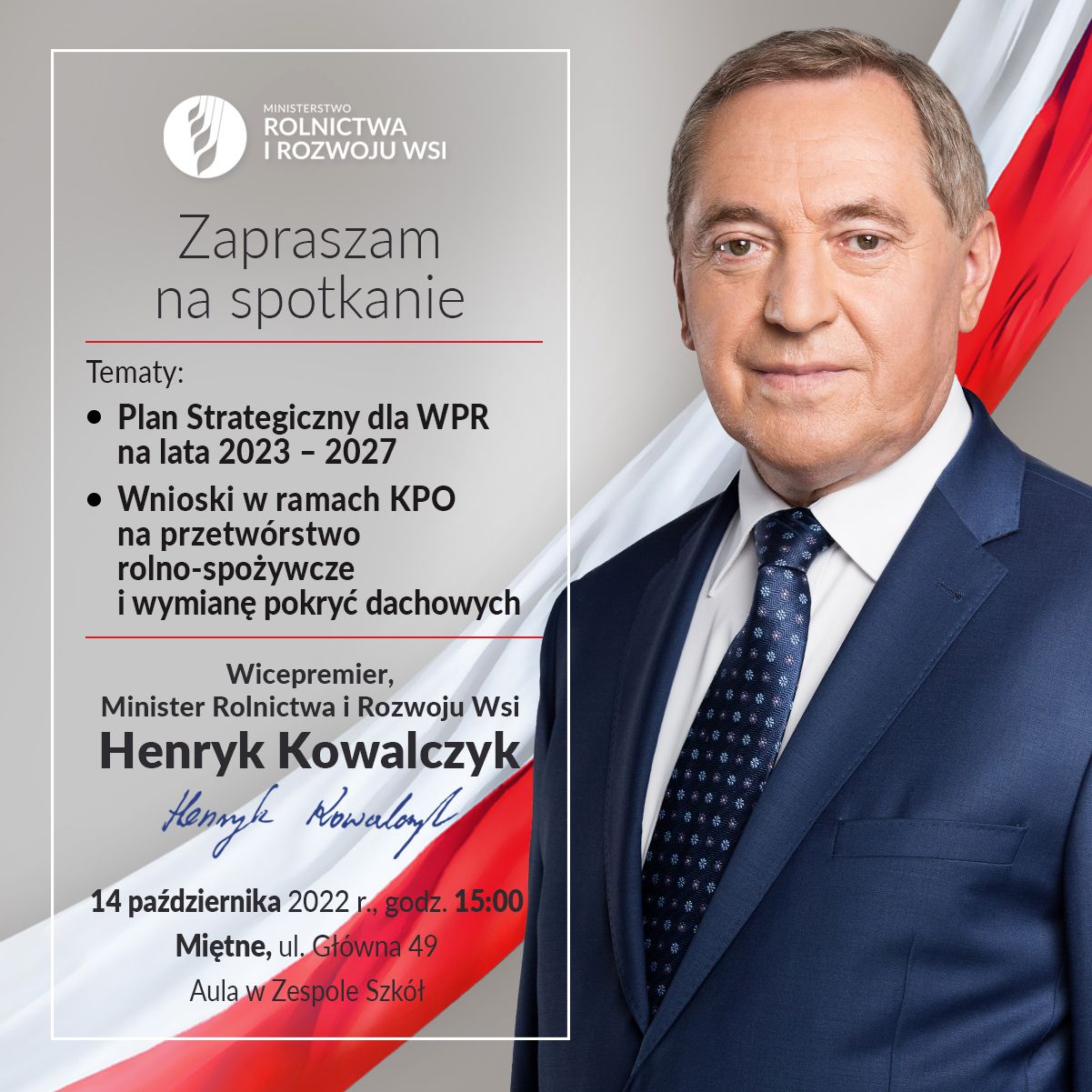 14 października w Auli Zespołu Szkół im. Stanisława Staszica w Miętnem odbędzie się spotkanie z wicepremierem, ministrem rolnictwa i rozwoju wsi Henrykiem Kowalczykiem. Początek o godz. 15:00.