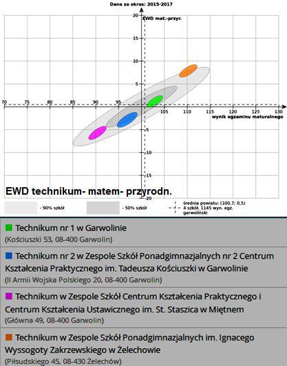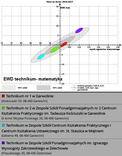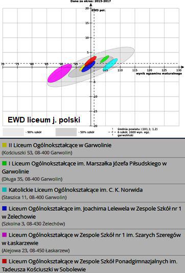 Jak widać na prezentowanych wykresach wśród szkół powiatowych szkołami sukcesu w każdym z badanych obszarów są: KLO im. K.C.Norwida w Garwolinie i I LO im. Marszałka J. Piłsudskiego w Garwolinie oraz Technikum w ZSP im. Ignacego Wyssogoty Zakrzewskiego w Żelechowie i Technikum w ZSP nr 1 im. Bohaterów Westerplatte w Garwolinie.