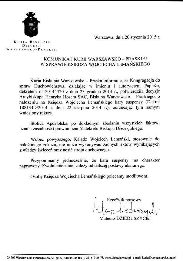 Kuria Biskupia Warszawsko-Praska informuje, że Kongregacja do spraw Duchowieństwa, działając w imieniu i autorytetem Papieża, dekretem nr 20144320 z dnia 23 grudnia 2014 r., potwierdziła decyzję Arcybiskupa Henryka Hosera SAC, Biskupa Warszawsko-Praskiego, o nałożeniu na Księdza Wojciecha Lemańskiego kary suspensy (Dekret 1881/BD/2014 z dnia 22 sierpnia 2014 r.), odrzucając tym samym wniesiony rekurs.