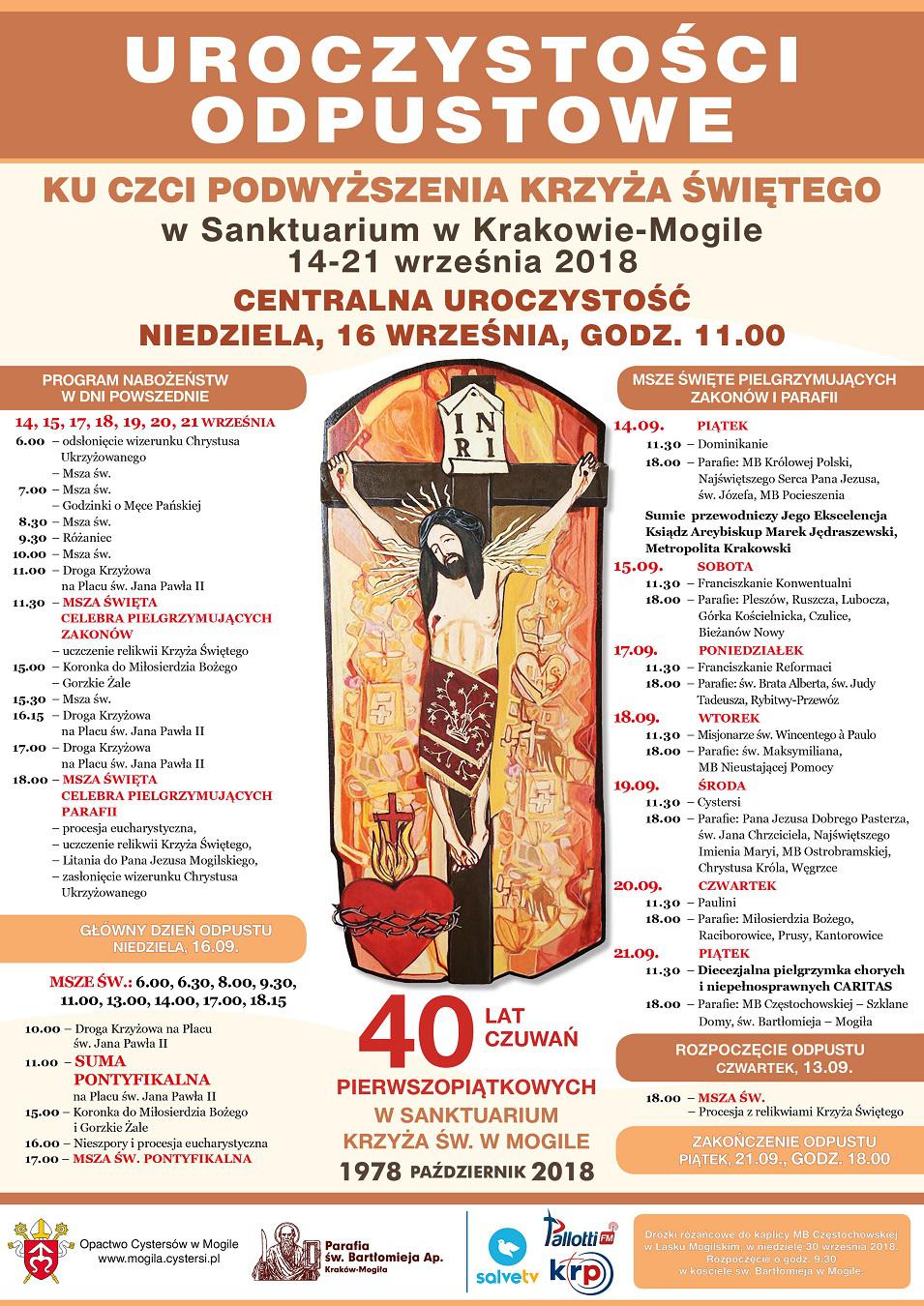 Odpust w Mogile rozpoczyna w czwartek 13 września, godz. 18.00 Msza św. z procesją, podczas której niesione są relikwie Krzyża Świętego. W dni powszednie odpustu, według stałego porządku, odprawiane są w bazylice Msze św. (6.00, 7.00, 8.30, 10.00, 11.30, 15.30, 18.00) i nabożeństwa, podczas których przybywający licznie pielgrzymi rozważają mękę naszego Zbawiciela, uwielbiają Go i dziękują za wszelkie dobro w życiu.W tych dniach o godz. 11.30 odprawiana jest uroczysta Msza św., której przewodniczą wspólnoty zakonne z Krakowa: dominikanie, franciszkanie konwentualni, franciszkanie reformaci, księża misjonarze św. Wincentego á Paulo, cystersi oraz paulini.