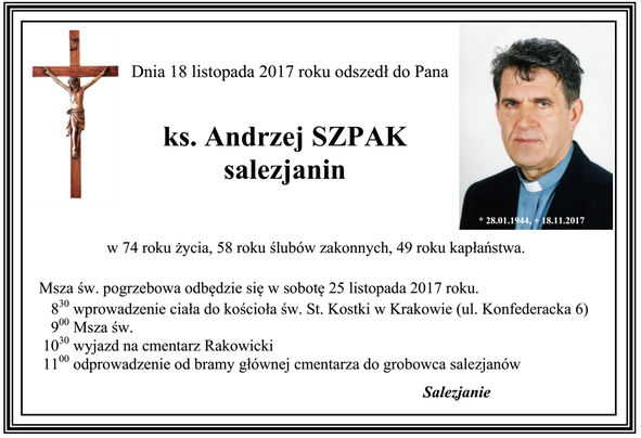 Podkreślała wtedy, że jest on „prawdziwie tatą, a dla naszych dzieci dziadkiem”. „W całym swoim człowieczeństwie nie buduje pozy siebie samego, ale całkowicie przylgnięty do Boga i Maryi – z którymi jest w niezwykłej przyjaźni dziecięctwa, rzuca się w szaleństwo Bożego entuzjazmu i od wielu lat to działa!” – przekonywała.„Odszedł wycieńczony chorobą w otoczeniu współbraci, młodzieży i wychowanków, którzy z wielką miłością czuwali przy jego łóżku” – głosi sobotni komunikat zamieszczony na facebookowym profilu Inspektorii Krakowskiej Salezjanów. Ostatnie chwile legendarnego duszpasterza wspominają jego wychowankowie: „Szpaku jak Abraham, wszędzie jego dzieci się plączą po korytarzu. Salezjanie ciągle chodzą i powtarzają, że to dla nich najwspanialsze świadectwo. Ci wszyscy ludzie, którzy przychodzą do Szpaka. Jeden powiedział, dzisiaj, że aż się chce być salezjaninem. Dzisiaj Inspektor mówił klerykom kazanie o Szpaku, wskazując go jako żywy przykład podążania za powołaniem”.