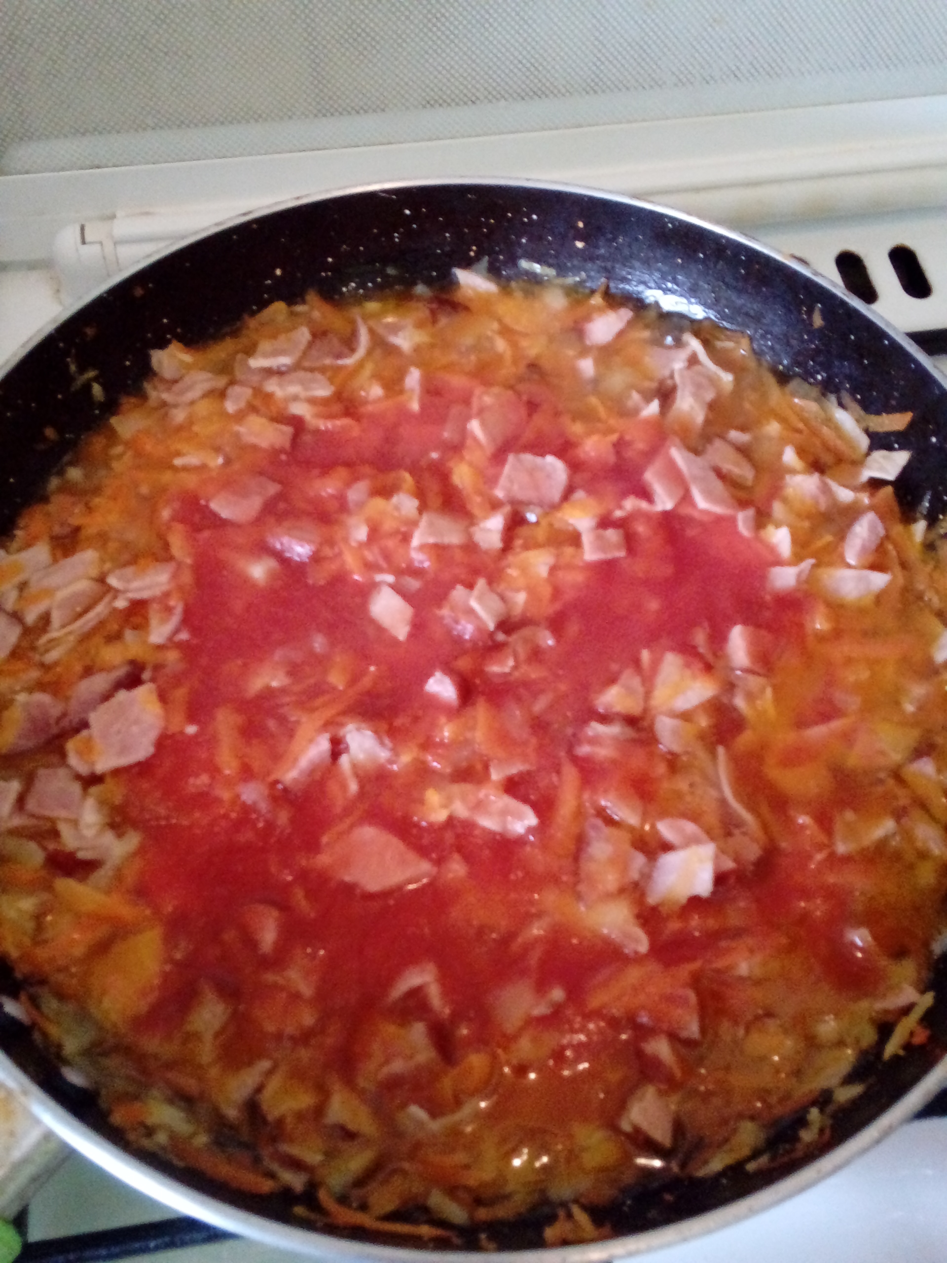 W oddzielnym naczyniu zeszklić na oleju pokrojoną w drobną kostkę cebulę. Dodać startą na tarce marchewkę oraz pietruszkę, a także listki laurowe i ziarenka pieprzu i dusić 10 minut, podlewając od czasu do czasu rosołem. Do duszonych warzyw dodać pokrojoną w paseczki wędzonkę i włać szklankę soku pomidorowego. Dusić jeszcze 10 minut.
