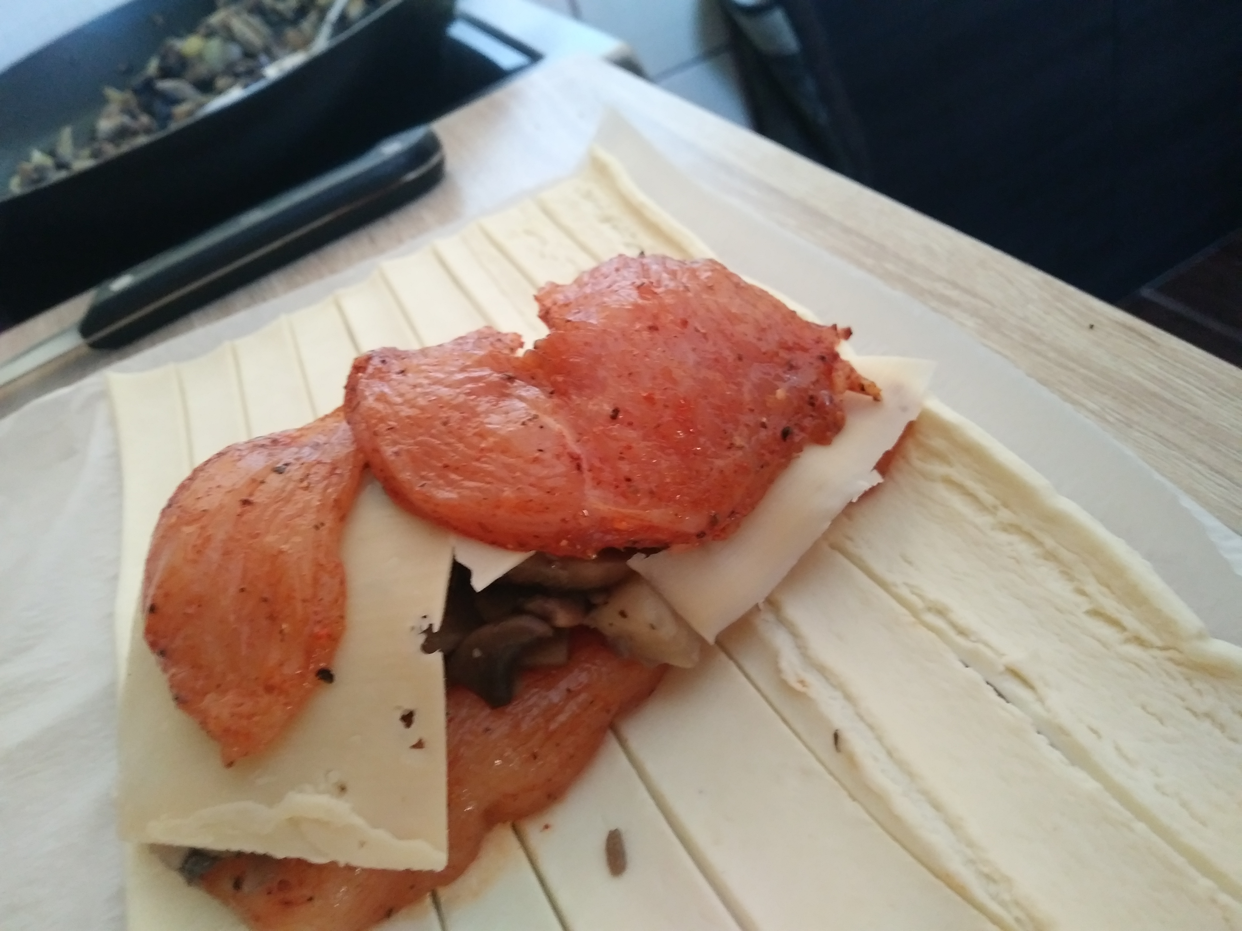 Ciasto dzielimy na trzy części, na środku każdej z nich układamy pierś, pieczarki, na to ocieramy żółty ser