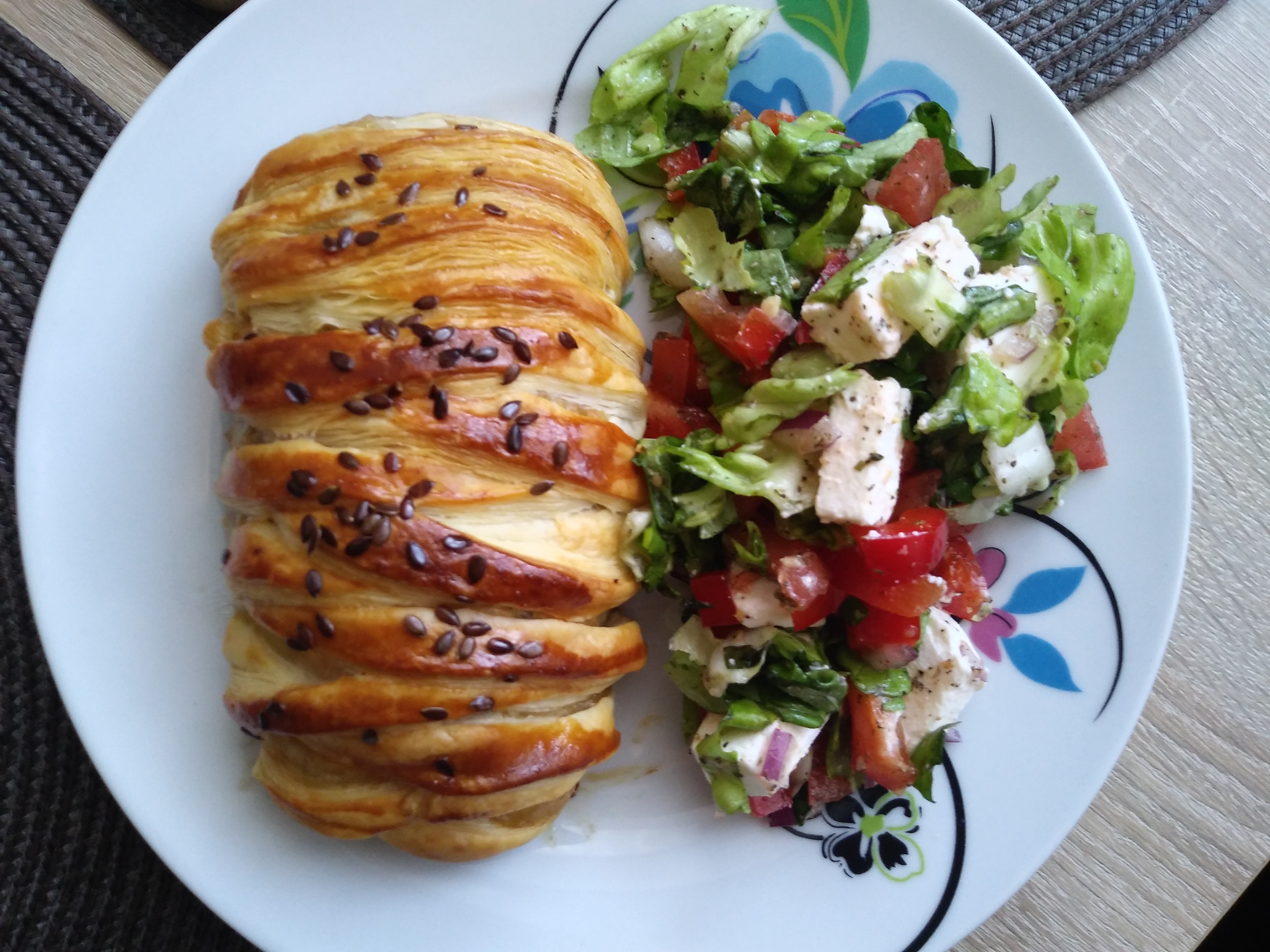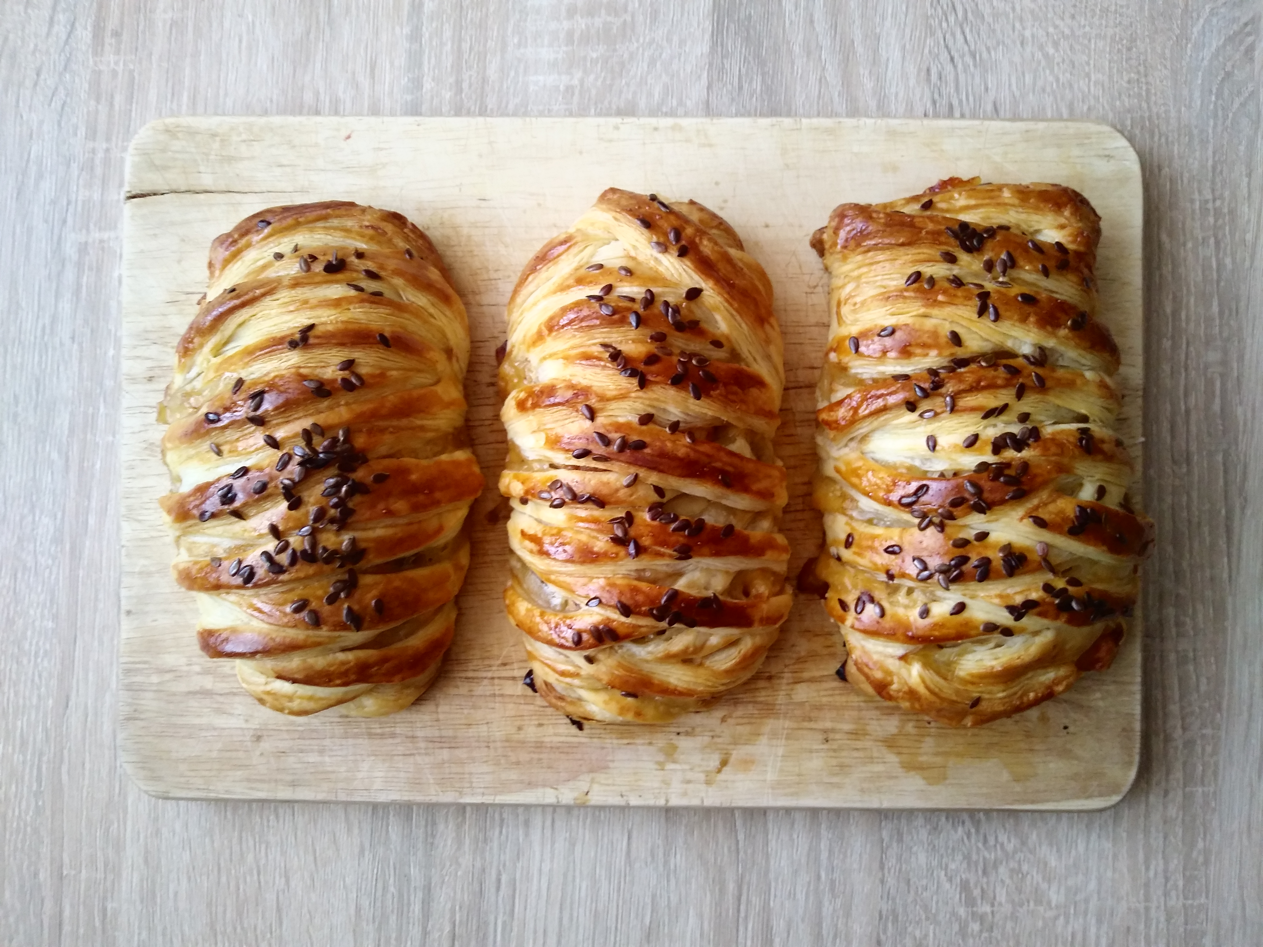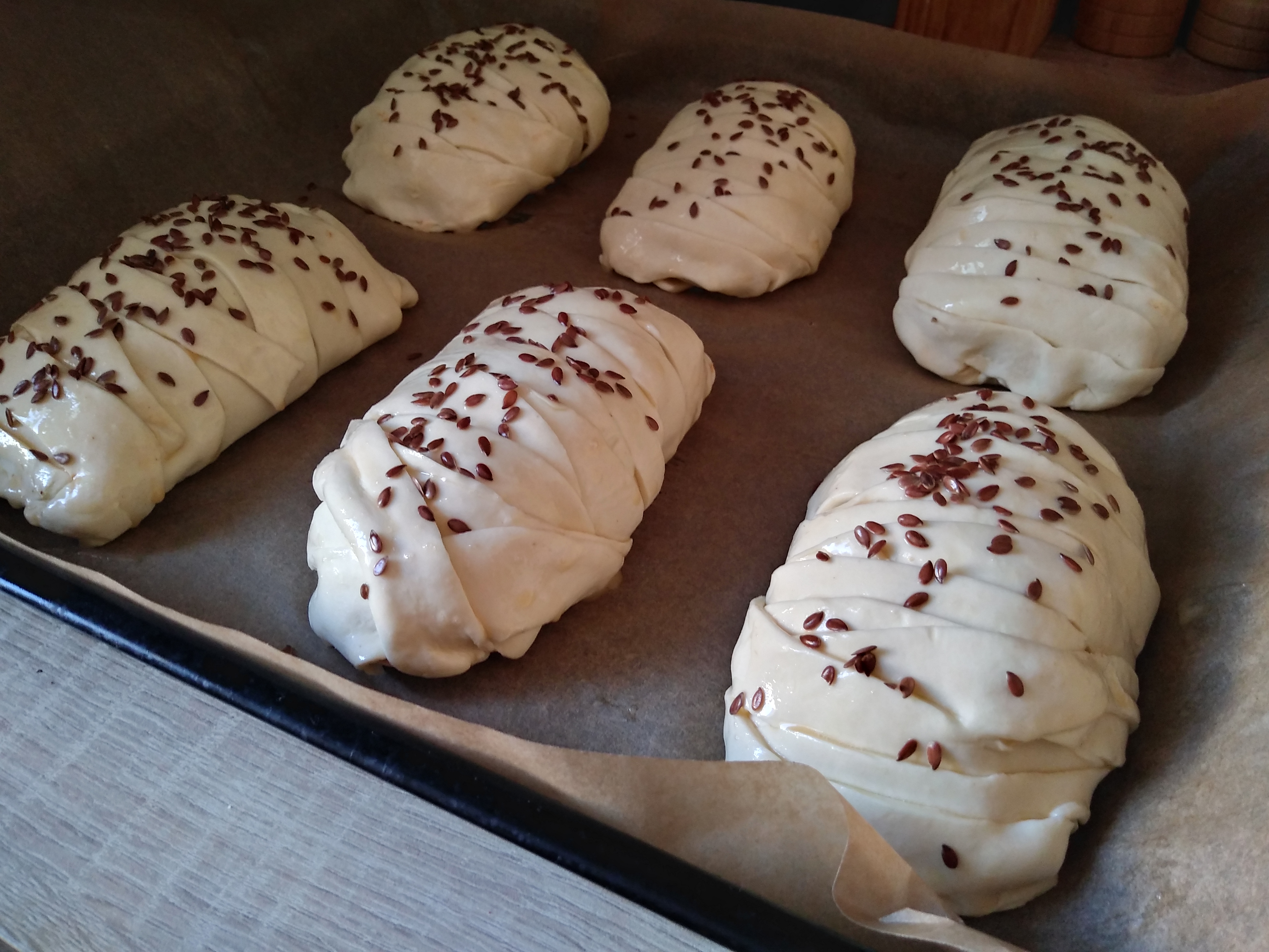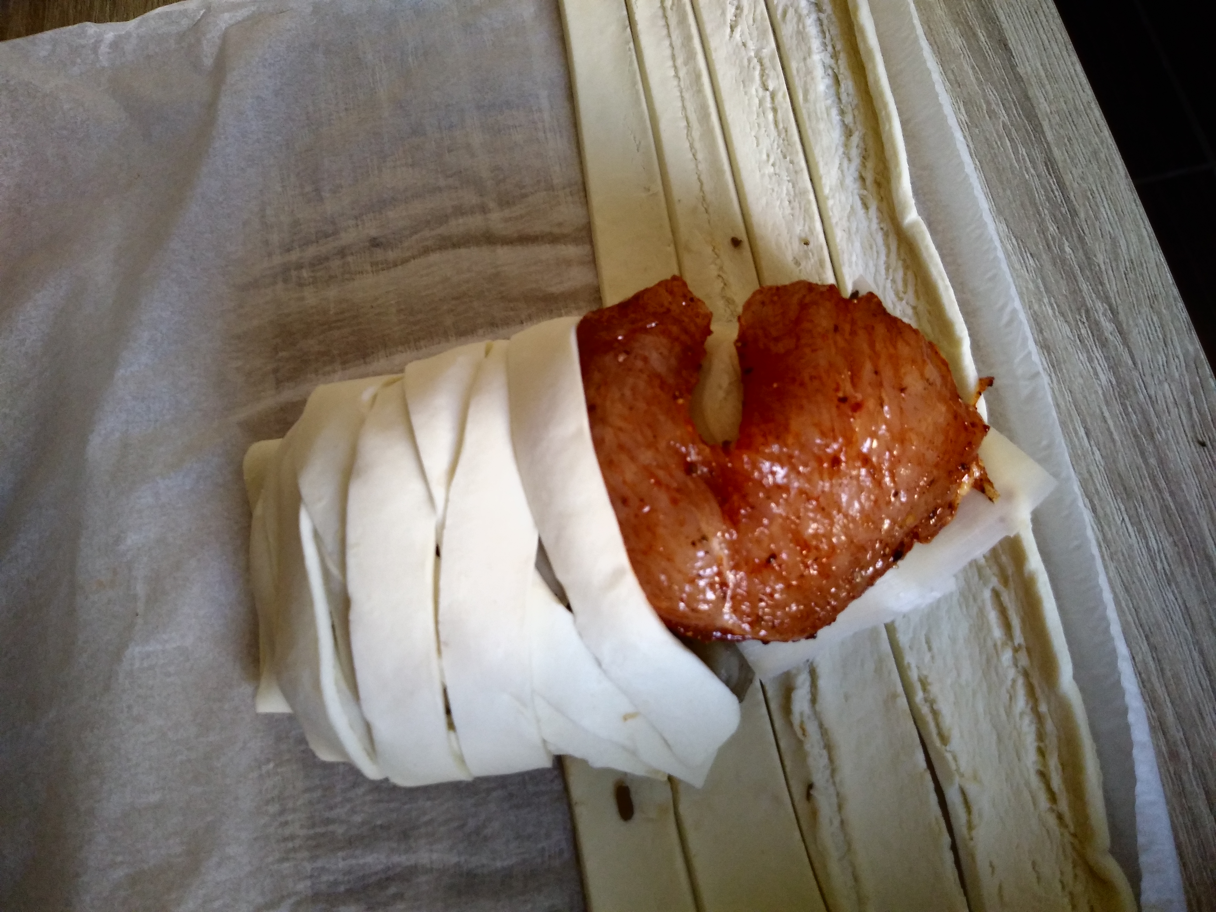 lub kładziemy plastry sera i ponownie kładziemy kawałki mięsa, boki ciasta nacinamy w paski i zwijamy w warkocz. Smarujemy roztrzepanym jajkiem i posypujemy siemieniem lnianym.