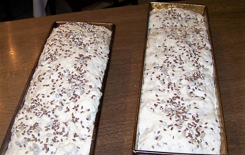Pomieszać wszystkie składniki z rozczynem. 2 foremki prostokątne (keksówki lub takie na pasztet) smarujemy olejem posypujemy bułką tarta, wlewamy pomieszane ciasto - odstawiamy na 30 minut aby podwoiło swoją objętość.