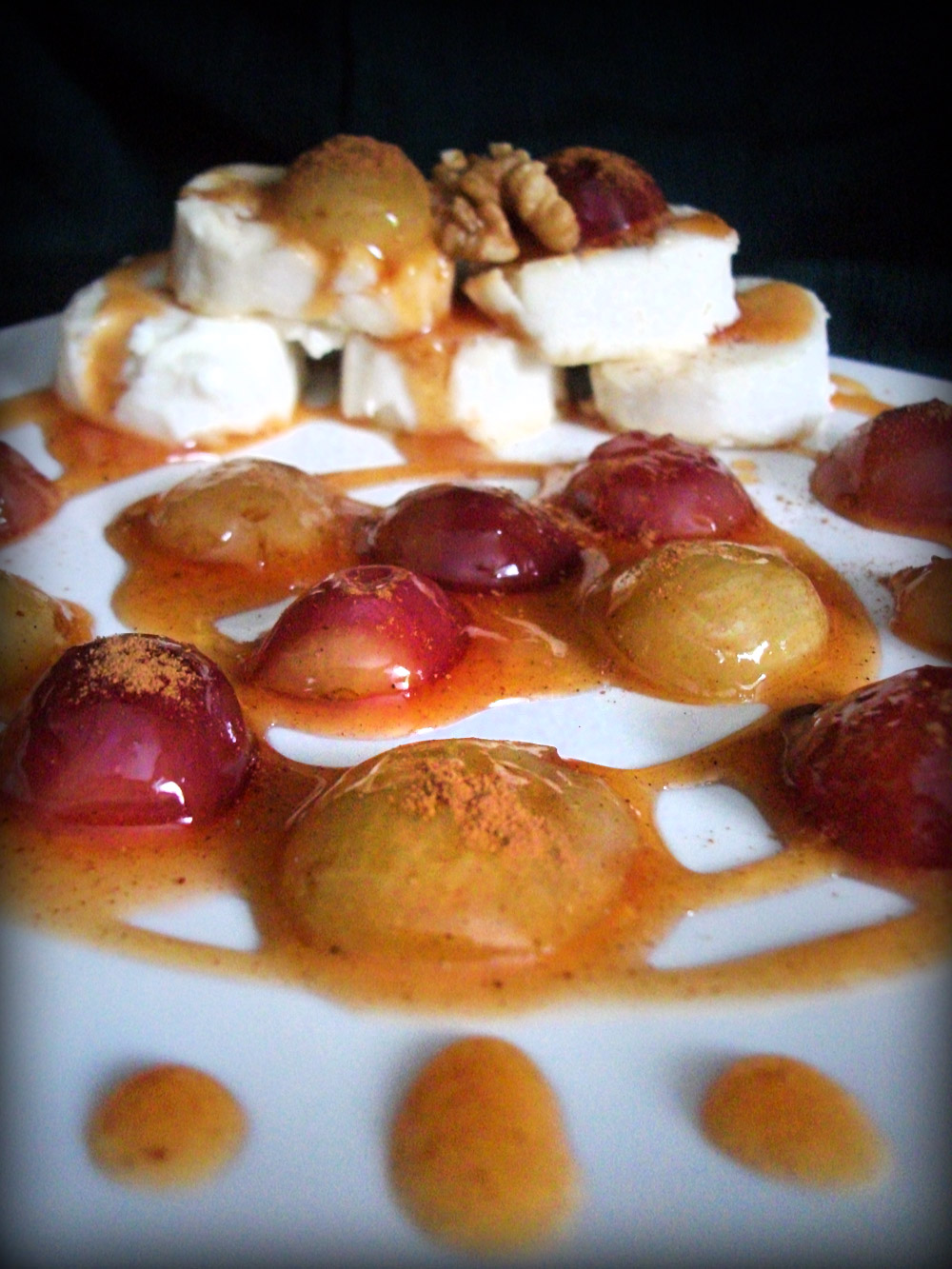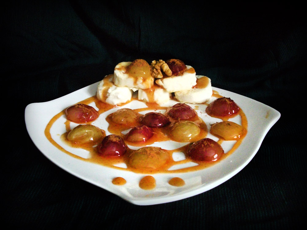 Talerz dekorujemy sosem karmelowym i winogronami, przyozdabiamy odrobiną cynamonu. A później delektujemy się tym nietypowym połączeniem smaków.