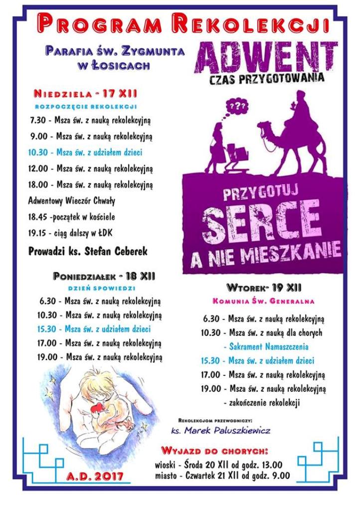 Od 17 do 19 grudnia w parafii św. Zygmunta będą się odbywać rekolekcje adwentowe. W niedzielę po Mszy św. o godz. 18.00 przygotowany zostanie Wieczór Chwały.