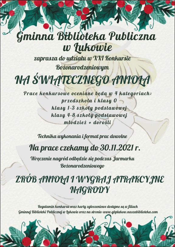 Do końca listopada Gminna Biblioteka Publiczna czeka na prace od osób, które zechcą wziąć udział w kolejnej edycji bożonarodzeniowego konkursu plastycznego. Jego tematem przewodnim są anioły. W konkursie mogą wziąć udział nie tylko dzieci i młodzież, ale również dorośli.