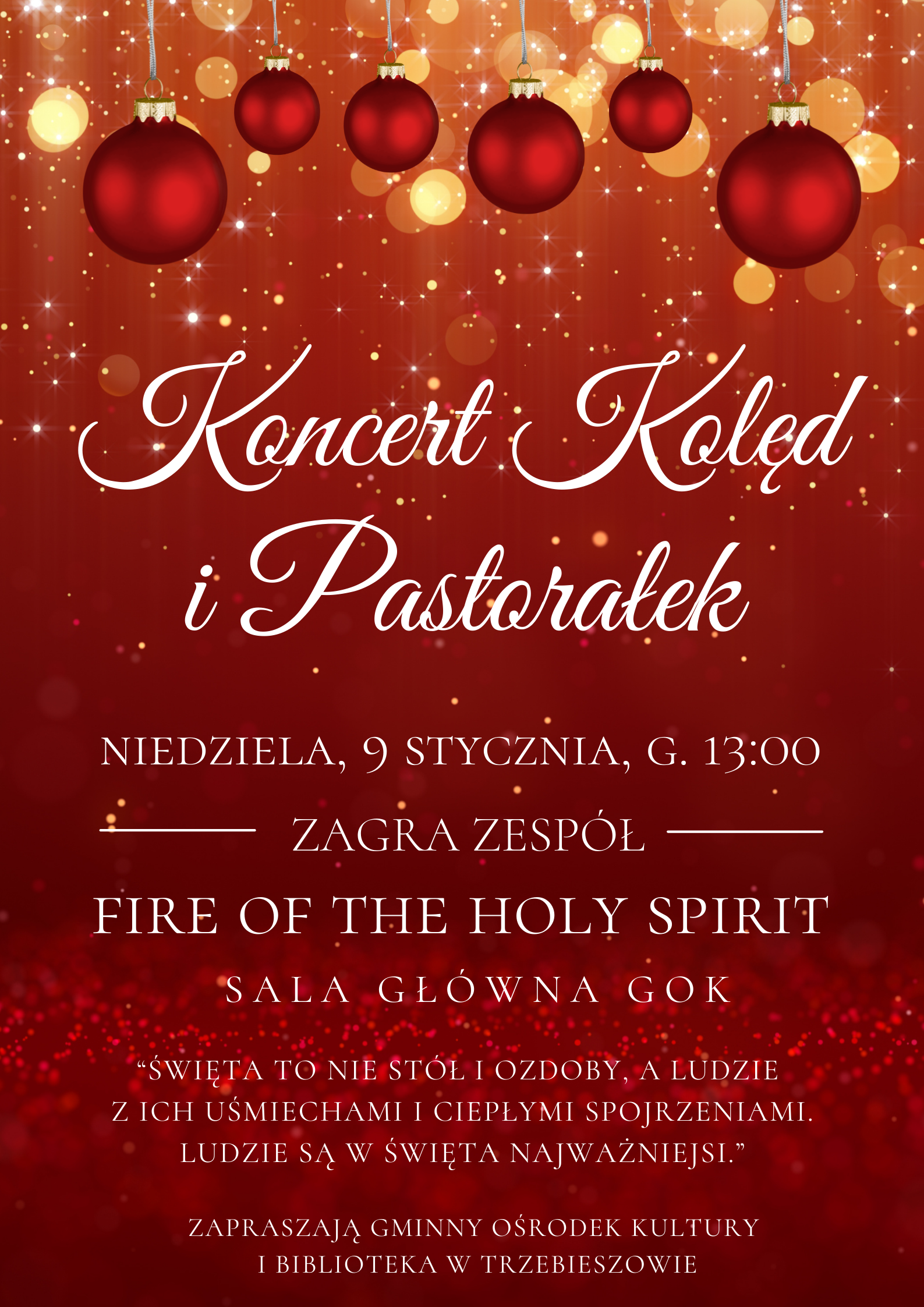 W niedzielę, 9 stycznia o godzinie 13:00 w Sali Głównej Gminnego Ośrodka Kultury w Trzebieszowie odbędzie się koncert zespołu „Fire of the Holy Spirit” pod kierownictwem Łukasza Orzełowskiego.