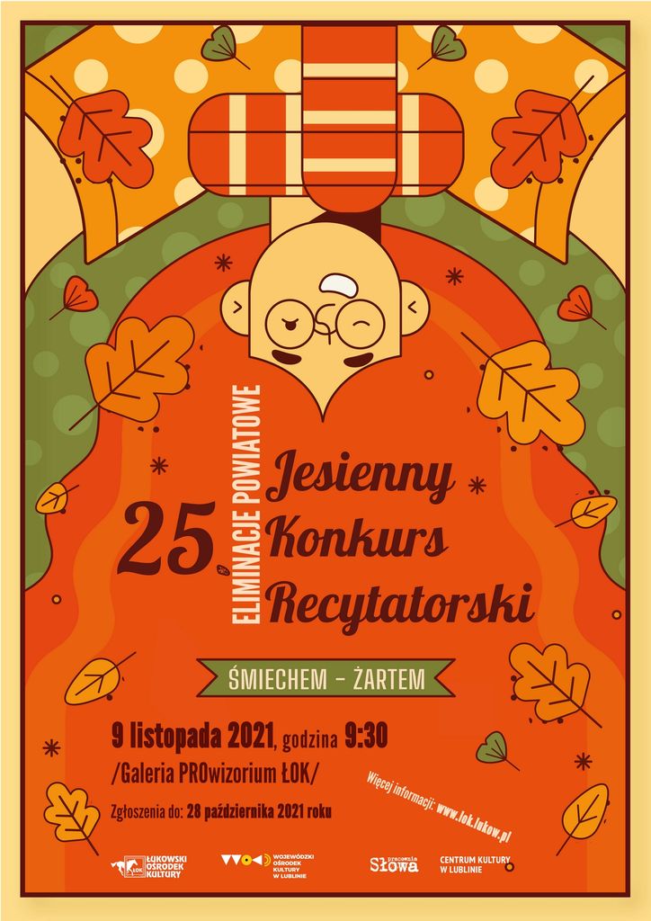 Zgłoszenia od osób, które zechcą wziąć w 25. Jesiennym Konkursie Recytatorskim przyjmowane są w Łukowskim Ośrodku Kultury do 28 października. Regulamin konkursu oraz karta zgłoszenia są dostępne na stronie ŁOK. Eliminacje powiatowe odbędą się w Galerii PROwizorium Łukowskiego Ośrodka Kultury we wtorek 9 listopada.