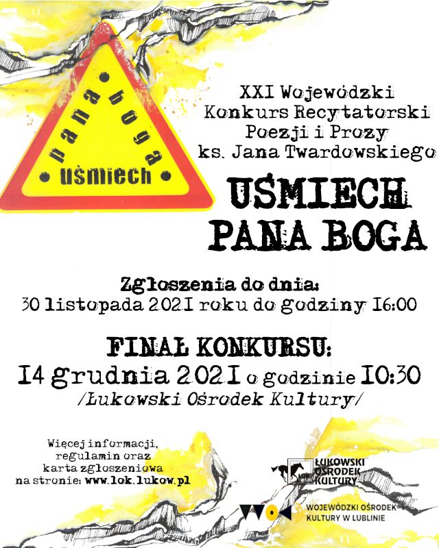 W Łukowskim Ośrodku Kultury rozpoczęło się przyjmowanie zgłoszeń od osób, które chcą wziąć udział w XXI Wojewódzkim Konkursie Recytatorskim Poezji i Prozy Ks. Jana Twardowskiego „Uśmiech Pana Boga”. Zgłoszenia przyjmowane są do końca listopada.