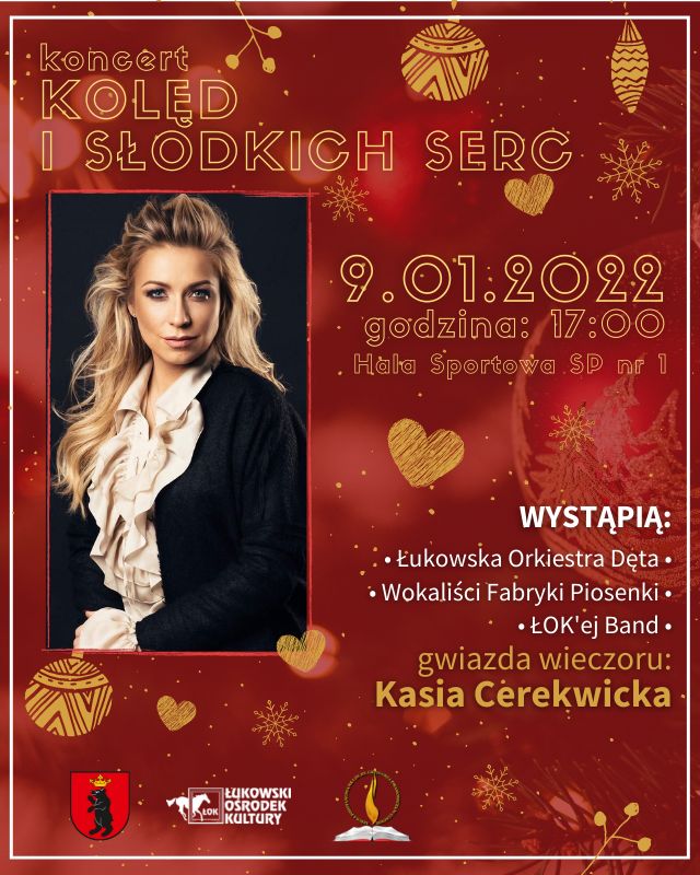 Łukowski Ośrodek Kultury poinformował o nowym terminie Koncertu Kolęd i Słodkich Serc. Pierwotnie miał się on odbyć 12 grudnia. Przełożono go na 9 stycznia 2022 roku. Nie zmieniła się natomiast gwiazda wieczoru. Tak jak planowano będzie nią Kasia Cerekwicka.