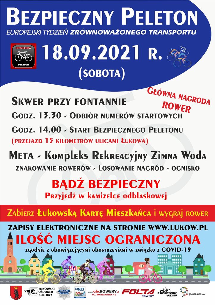 W sobotę 18 września ulicami Łukowa przejedzie „Bezpieczny Peleton”. Start rowerzystów – skwer przy fontannie, godzina 14.00. Meta – zalew Zimna Woda.
