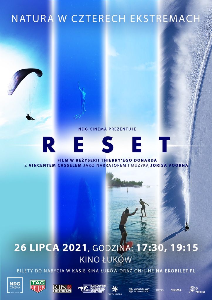 „Reset” to porywający europejski film dokumentalny okrzyknięty najbardziej widowiskową premierą tego lata. To widowisko pełne charyzmatycznych, inspirujących postaci i ich pasji stworzone specjalnie na kinowe ekrany. Opowieść o filozofii życia ludzi, którzy poświęcają się sportom ekstremalnym w ścisłym związku z naturą. Od koła podbiegunowego po piaszczyste plaże Polinezji Francuskiej. Pozwala oderwać się od otaczającej nas szarej rzeczywistości i spojrzeć na świat z zupełnie innej strony.