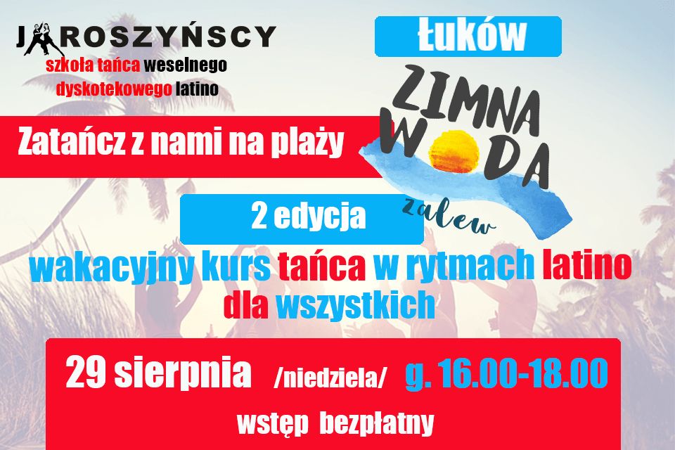 Bez względu na pogodę, w najbliższą niedzielę 29 sierpnia nad zalewem Zimna Woda w Łukowie ma odbyć się po raz drugi kurs tańca w rytmach latino. Jest on bezpłatny, a udział w nim mogą wziąć wszyscy, którzy tylko chcą.