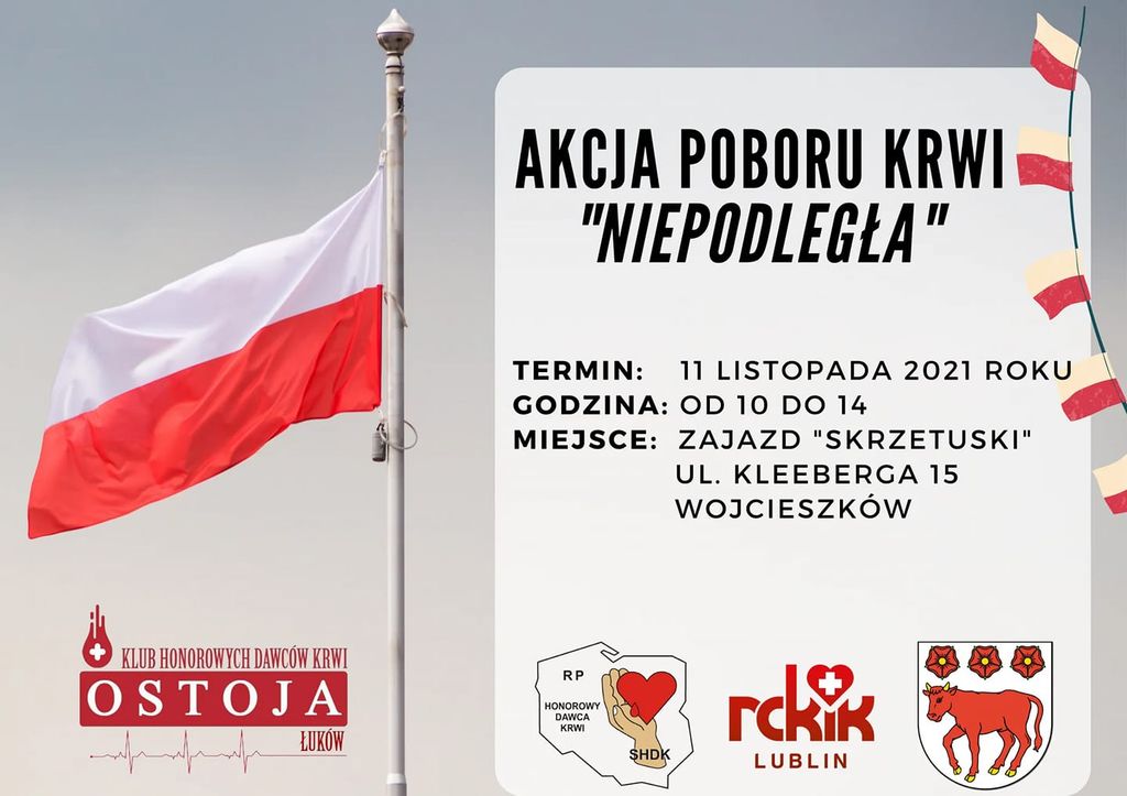 Akcja poboru krwi organizowana przez łukowski klub „Ostoja”, Regionalne Centrum Krwiodawstwa i Krwiolecznictwa w Lublinie oraz władze gminy Wojcieszków, będzie odbywała się pod hasłem „Niepodległa”. Osoby, które będą chciały podzielić się tym najcenniejszym darem, powinny pojawić się w Zajeździe Skrzetuski. Akcja rozpocznie się o godzinie 10.00 i potrwa do godziny 14.00.