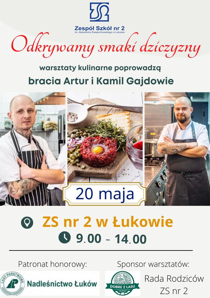 Uczniowie Zespołu Szkół nr 2 w Łukowie będą mogli poznać tajniki przyrządzania dań z dziczyzny. Tą wiedzą podzielą się z nimi podczas warsztatów kulinarnych bracia Artur i Kamil Gajda, kucharze. Zajęcia odbędą się w piątek 20 maja.