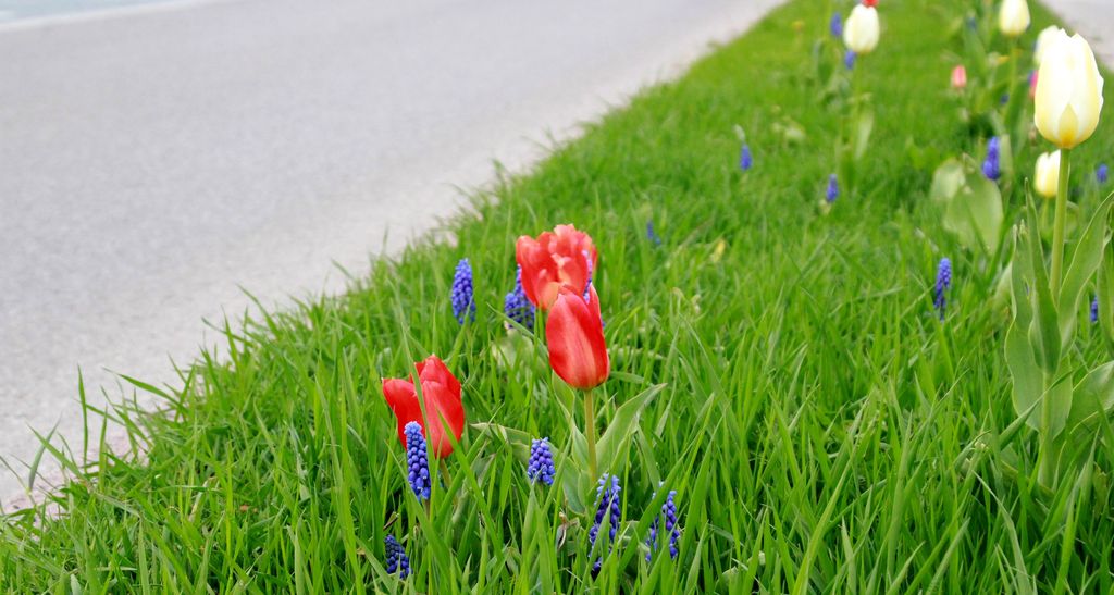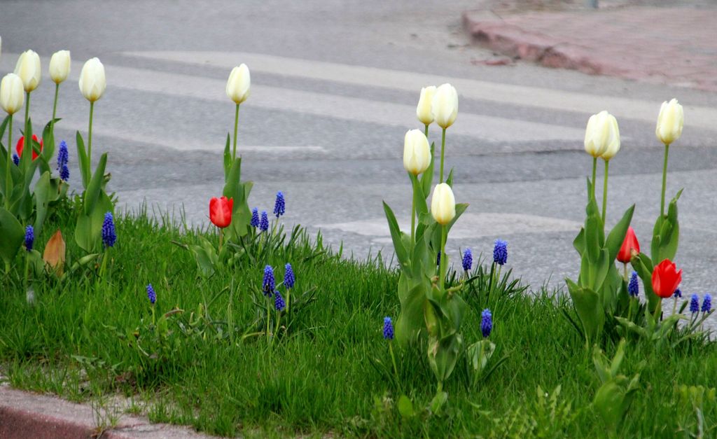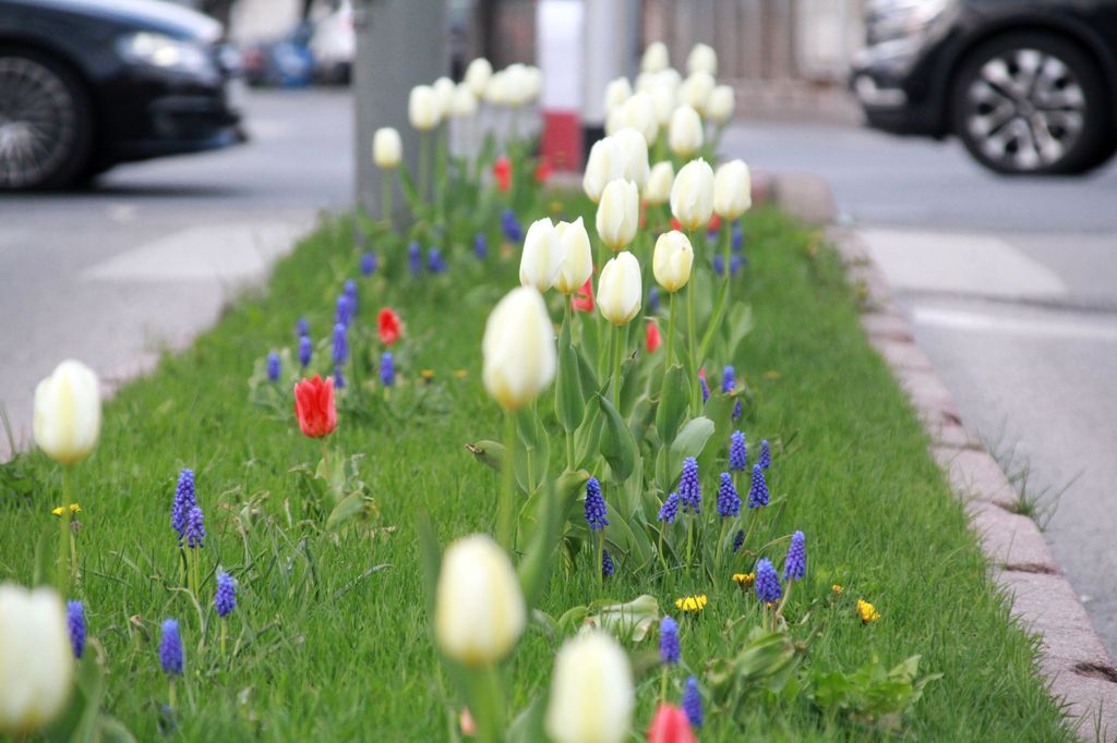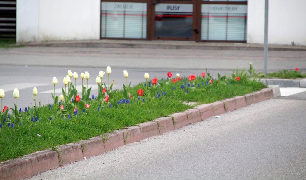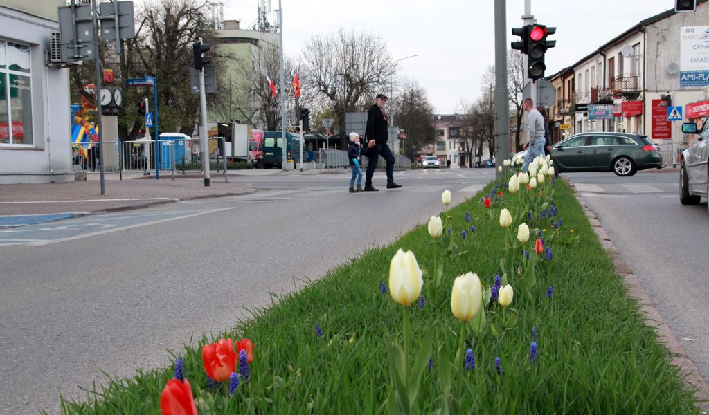 Przy ulicy Lewickiego w Łukowie pojawiły się tulipany i szafirki. Sadzili je pracownicy Zarządu Dróg Miejskich.