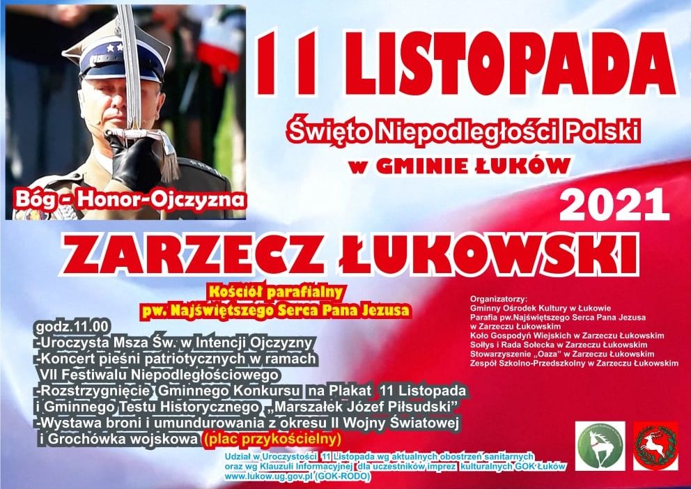Obchody Święta Niepodległości rozpoczną się w gminie Łuków od Mszy Świętej w intencji Ojczyzny, która zostanie odprawiona w kościele Najświętszego Serca Pana Jezusa w Zarzeczu Łukowskim. Eucharystia rozpocznie się o godzinie 11.00 Następnie odbędzie się koncert pieśni patriotycznych w ramach VII Festiwalu Niepodległościowego. Będzie też rozstrzygnięcie Gminnego Konkursu na Plakat 11 Listopada i Gminnego Testu Historycznego „Marszałek Józef Piłsudski”. Obchodom będzie towarzyszyć wystawa broni i umundurowania z okresu II Wojny Światowej i wojskowa grochówka.