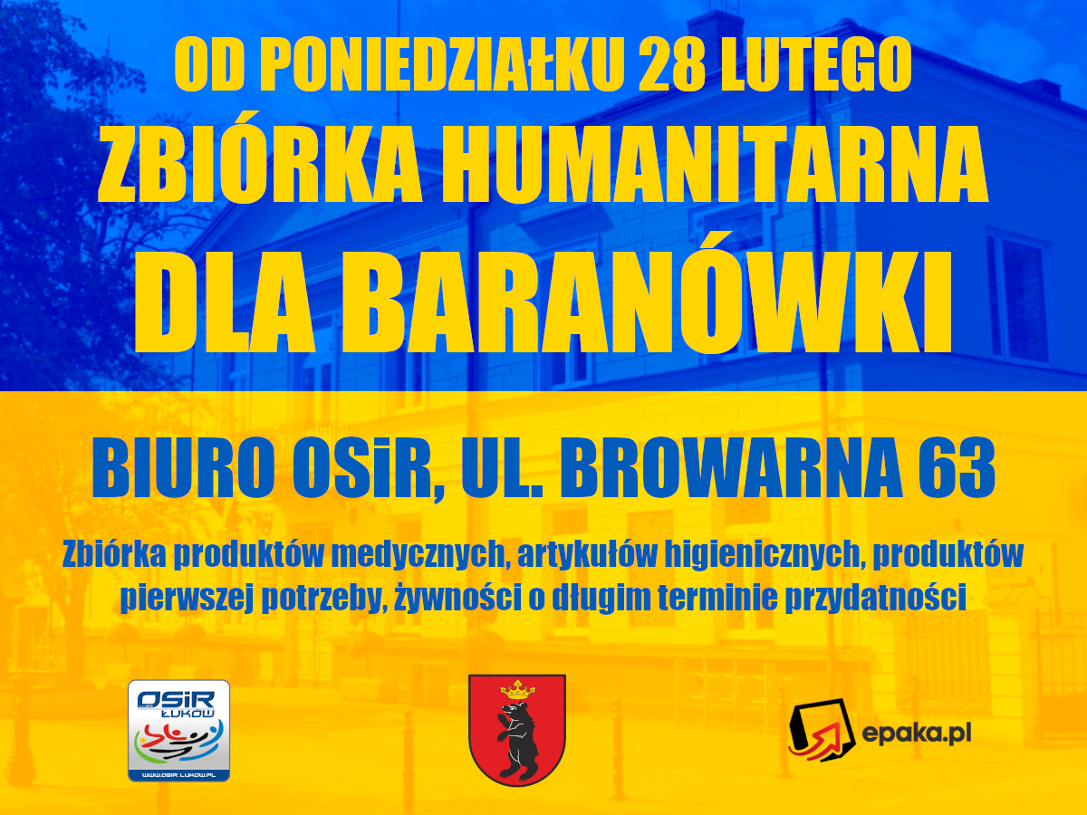 Jako miejsce zbiórki humanitarnej wyznaczono Ośrodek Sportu i Rekreacji w Łukowie (ul. Browarna 63). Osoby, które zechcą wesprzeć mieszkańców Baranówki, będą mogły przynosić produkty medyczne (np. bandaże, opatrunki, itp.), artykuły higieniczne i produkty pierwszej potrzeby (m.in. pasty do zębów, ręczniki, itp.), a także żywność o długim terminie przydatności do spożycia (kasze, makarony, żywność puszkowana, batony energetyczne, itp.)