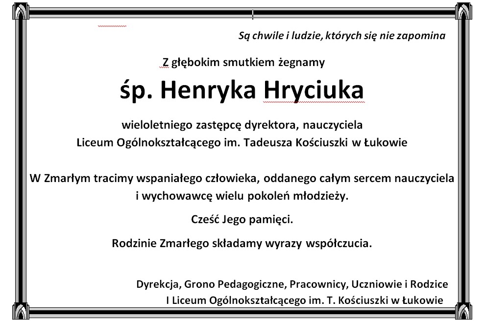 Śp. Henryk Hryciuk był przez wiele lat zastępcą dyrektora oraz nauczycielem w I Liceum Ogólnokształcącym im. T. Kościuszki w Łukowie. "W zmarłym tracimy wspaniałego człowieka, oddanego całym sercem nauczyciela i wychowawcę wielu pokoleń, młodzieży " - napisano na stronie placówki szkolnej.
