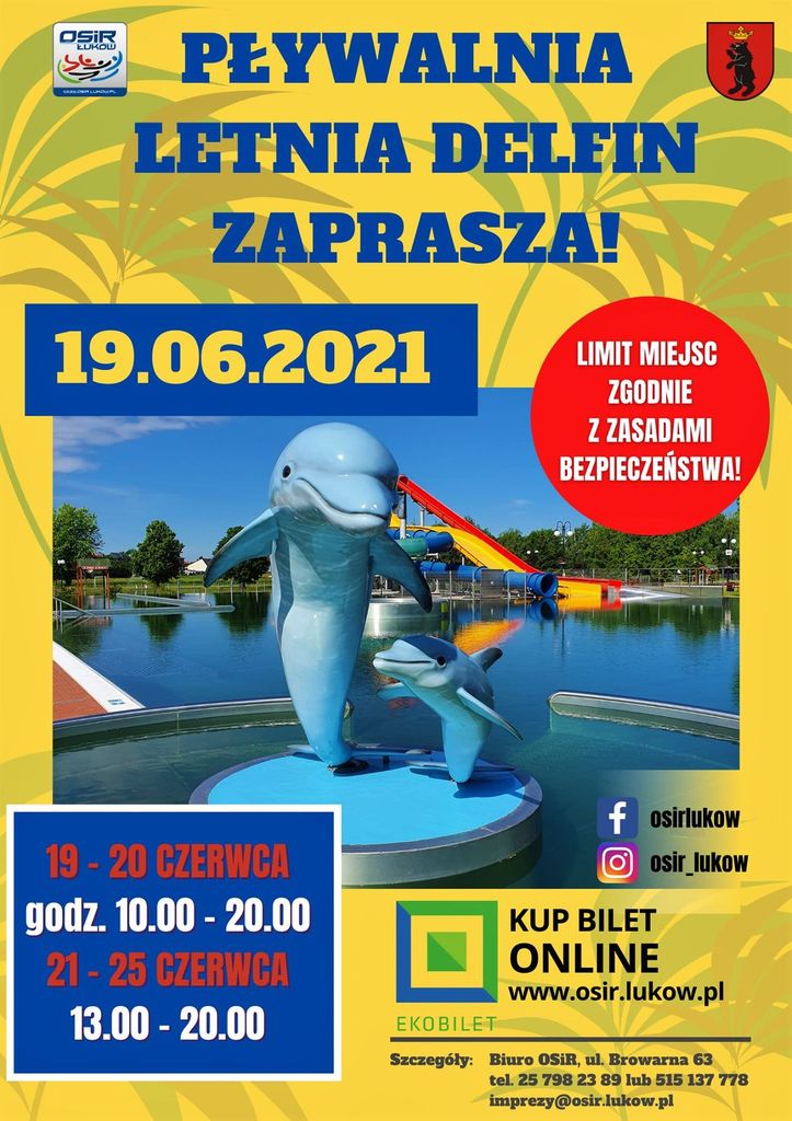 W sobotę 19 czerwca o godzinie 10.00 rusza letnia pływalnia „Delfin”. Będzie tam można spędzić cały dzień (http://www.podlasie24.pl/lukow/region/letnia-plywalnia-w-lukowie-rusza-19-czerwca-321c6.html).