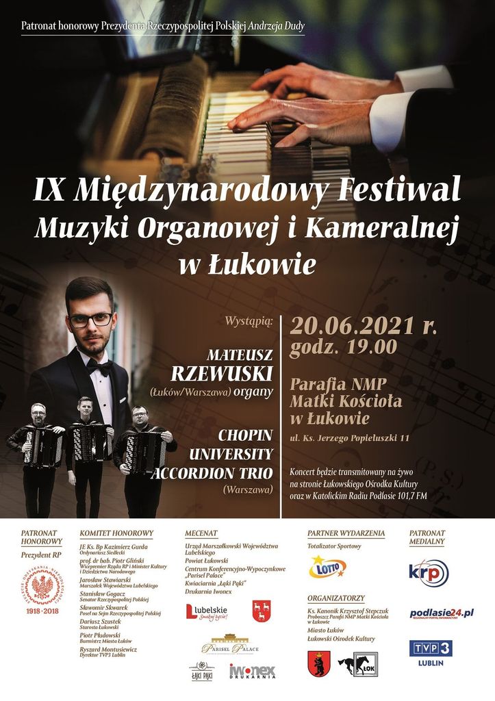Niedzielę zakończy drugi koncert odbywający w się w ramach Międzynarodowego Festiwalu Muzyki Organowej i Kameralnej w Łukowie. W kościele NMP Matki Kościoła na organach zagra dyrektor artystyczny Festiwalu Mateusz Rzewuski. Wystąpi też trio akordeonowe z Warszawy. Początek koncertu, którego będzie też można wysłuchać na antenie Katolickiego Radia Podlasie, godzina 19.00 (http://www.podlasie24.pl/lukow/kosciol/-miedzynarodowy-festiwal-muzyki-organowej-i-kameralnej-w-lukowie-321e4.html).