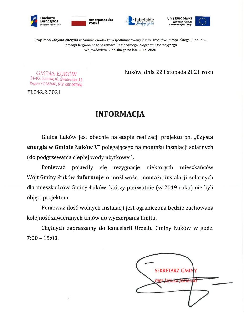 Jak informuje nas wójt Mariusz Osiak, niektóre osoby, które były zakwalifikowane do projektu, dziś z niego rezygnują. Powody są różne. Niektórzy sami na własny koszt zamontowali instalacje, a niektórzy wycofują się, bowiem wkład własny jest wyższy niż dwa lata temu. Wynosi obecnie około 4 tys. zł. Są też takie osoby, z którymi nie mogą skontaktować się pracownicy Urzędu Gminy.