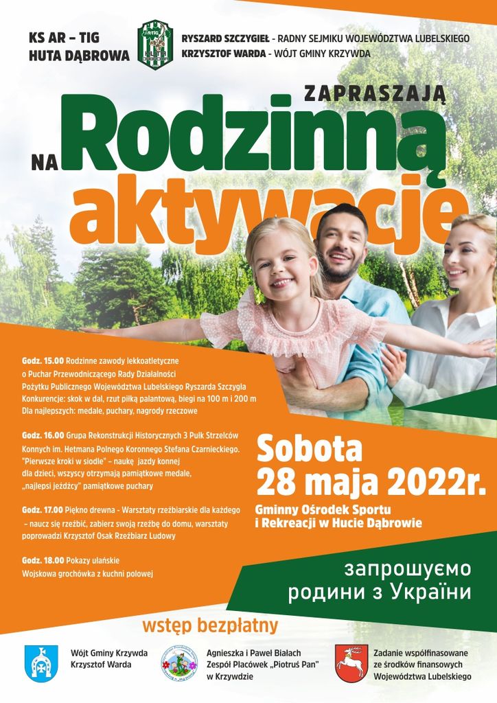 „Rodzinną Aktywację” organizuje Klub Sportowy AR-TIG Huta Dąbrowa, przy wsparciu Województwa Lubelskiego, Gminy Krzywda oraz Niepublicznego Przedszkola Integracyjnego Piotruś Pan w Krzywdzie.