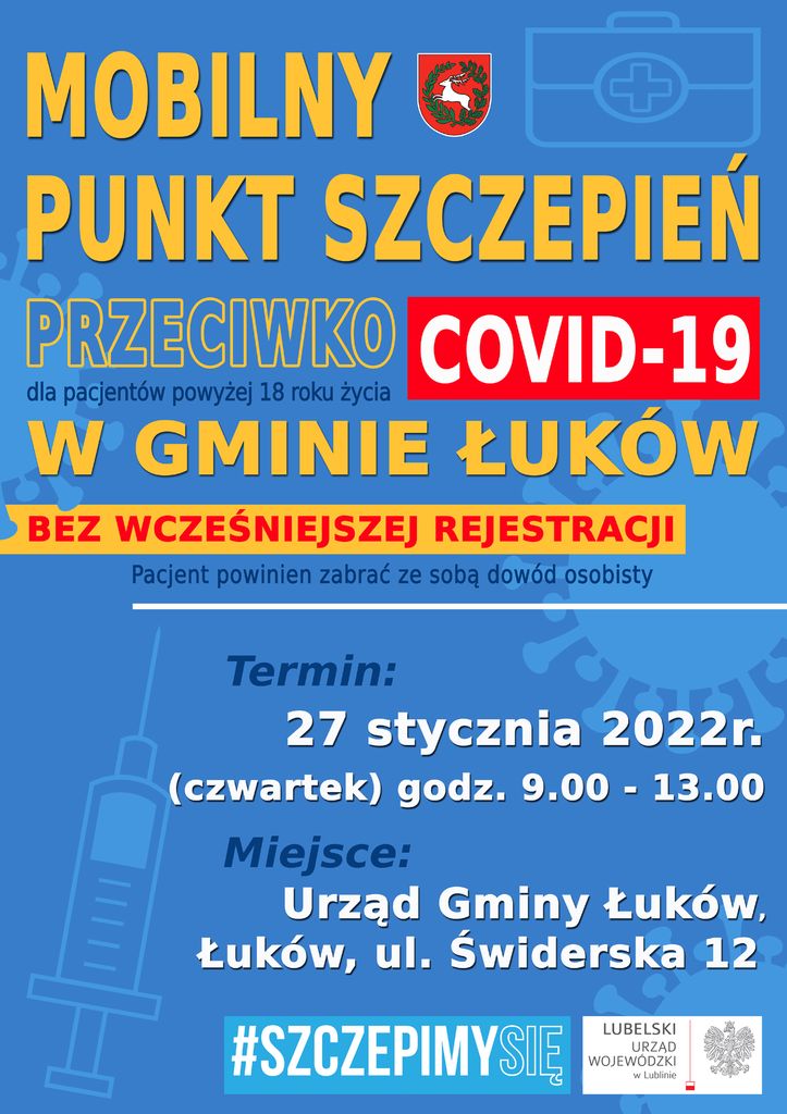 Na szczepienie przeciw COVID-19 mogą zgłaszać się osoby powyżej 18 roku życia. Nie potrzebna jest wcześniejsza rejestracja. Wystarczy mieć ze sobą dowód osobisty. Szczepienia będą się odbywały w czwartek 27 stycznia, w godzinach od 9.00 do 13.00 w Urzędzie Gminy Łuków przy ul. Świderskiej 12.