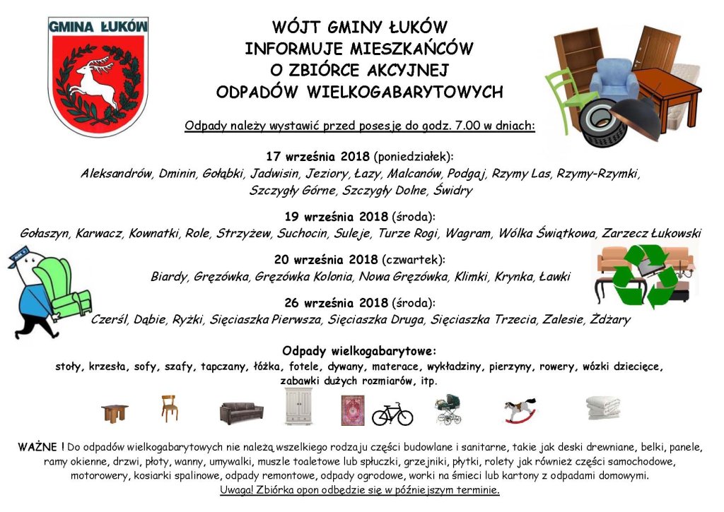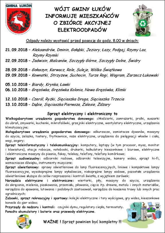 Od 17 do 26 września w poszczególnych miejscowościach będą odbierane odpady wielkogabarytowe, czyli na przykład: stare meble, dywany, materace, wykładziny, rowery, wózki dziecięce czy duże zabawki. Natomiast elektroodpady będą odbierane w terminie od 21 września do 13 października. Harmonogram odbioru odpadów znajdziecie Państwo na plakatach oraz na stronie Urzędu Gminy Łuków.