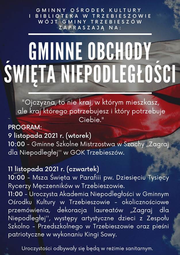 Następnie w GOK odbędzie się uroczysta akademia. W programie także okolicznościowe przemówienia i występy artystyczne dzieci z Zespołu Szkolno – Przedszkolnego w Trzebieszowie. Ponadto pieśni patriotyczne zaśpiewa Kinga Sowa. Zostaną też podsumowane Gminne Szkolne Mistrzostwa w Szachach „Zagraj dla Niepodległej”, które odbędą się 9  listopada w  GOK w Trzebieszowie.
