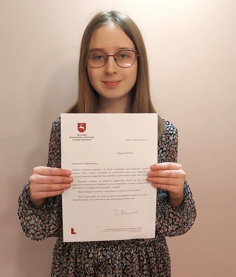 Kinga Zielińska uczennica „Piątki” została nagrodzona stypendium Marszałka Województwa Lubelskiego w ramach programu stypendialnego „Lubelskie wspiera uzdolnionych 2021-2023” realizowane przez Województwo Lubelskie w ramach 12 Osi Priorytetowej Edukacja, kwalifikacje i kompetencje Działanie 12.2 Kształcenie Ogólne Regionalnego Programu Operacyjnego Województwa Lubelskiego na lata 2014-2020,współfinansowanego przez Unię Europejską w ramach Europejskiego Funduszu Społecznego.