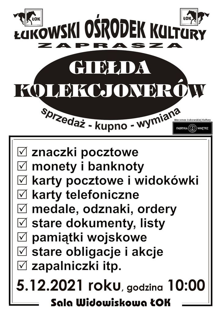 Giełda Kolekcjonerów ruszy o godzinie 10.00. Stoiska pojawią się w sali widowiskowej Łukowskiego Ośrodka Kultury. Na tym cyklicznym targowisku będzie można kupić, wymienić, obejrzeć oraz sprzedać znaczki pocztowe, monety i banknoty, karty pocztowe i widokówki, karty telefoniczne, medale, odznaki, ordery, stare dokumenty, listy, pamiątki wojskowe, stare obligacje i akcje, zapalniczki, zegarki, telefony, lampy i inne starocia.
