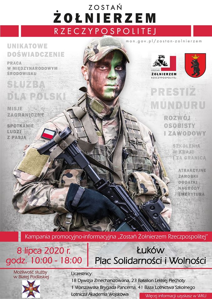 W Łukowie gościć będą przedstawiciele Wojskowej Komendy Uzupełnień z Białej Podlaskiej. Będą mówić o przebiegu rekrutacji oraz perspektywach służby w wojsku, o wymogach, które musi spełnić kandydat na żołnierza i o nauce w wojskowych akademiach. Z kolei żołnierze zdradzą jak wygląda ich codzienna służba. Spotkanie odbędzie się w środę 8 lipca. Przedstawiciele WKU pojawią się na Placu Solidarności i Wolności. Będą tam w godzinach od 10.00 do 18.00.