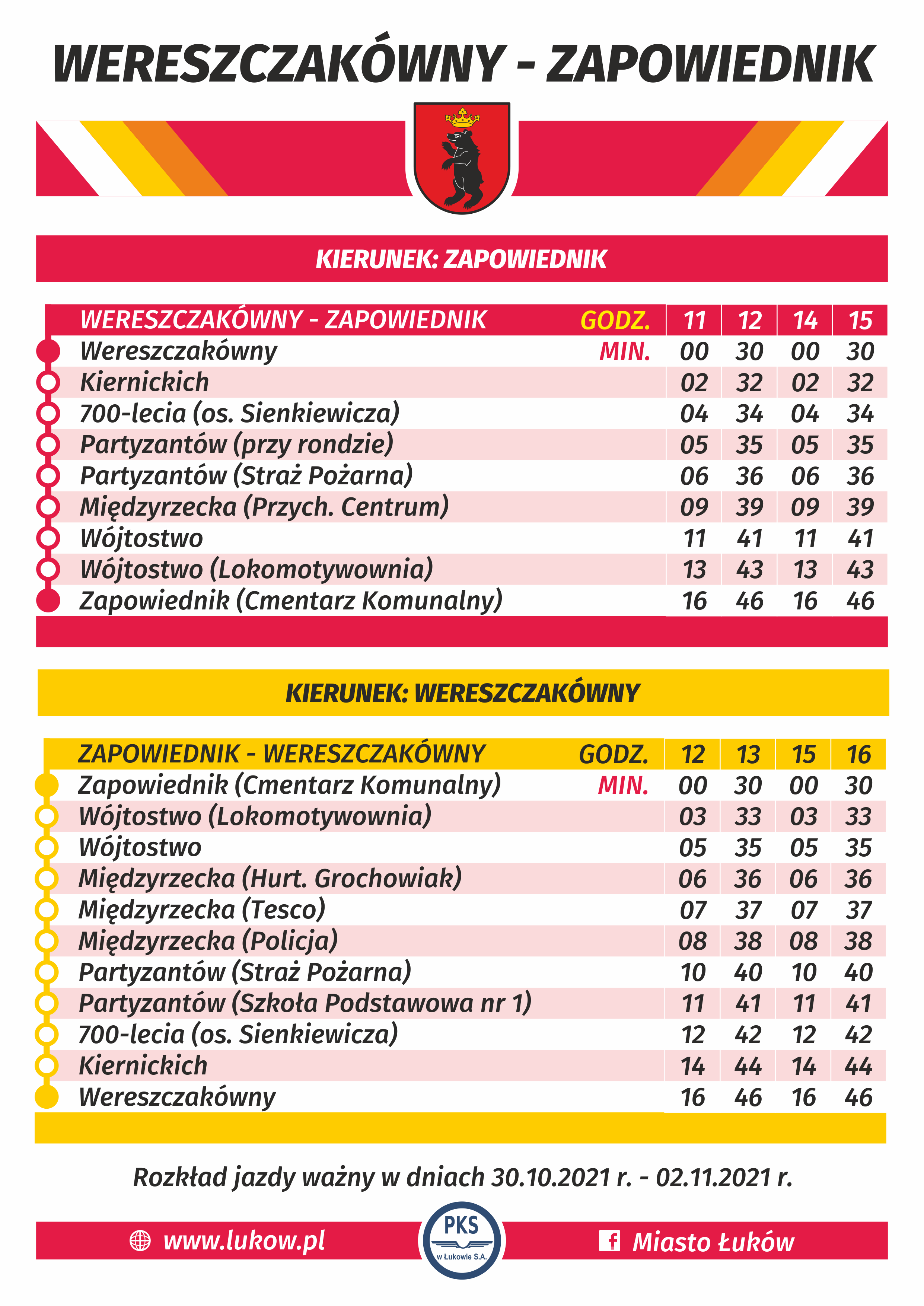 Jak informuje nas burmistrz Łukowa Piotr Płudowski na cztery dni uruchomiona zostanie specjalna linia, którą będzie można dojechać na cmentarz parafialny Świętego Rocha oraz na cmentarz komunalny przy ul. Zapowiednik. Kursy mają być dostosowane m.in. do godzin Mszy Świętych, które będą odbywać się na obu nekropoliach.