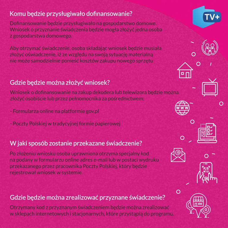 Więcej informacji o rządowym programie dofinansowania można znaleźć na stronie gov.pl/cyfrowatv, mailowo: cyfrowaTV@coi.gov.pl lub pod numerem telefonu: 42 253 54 30.