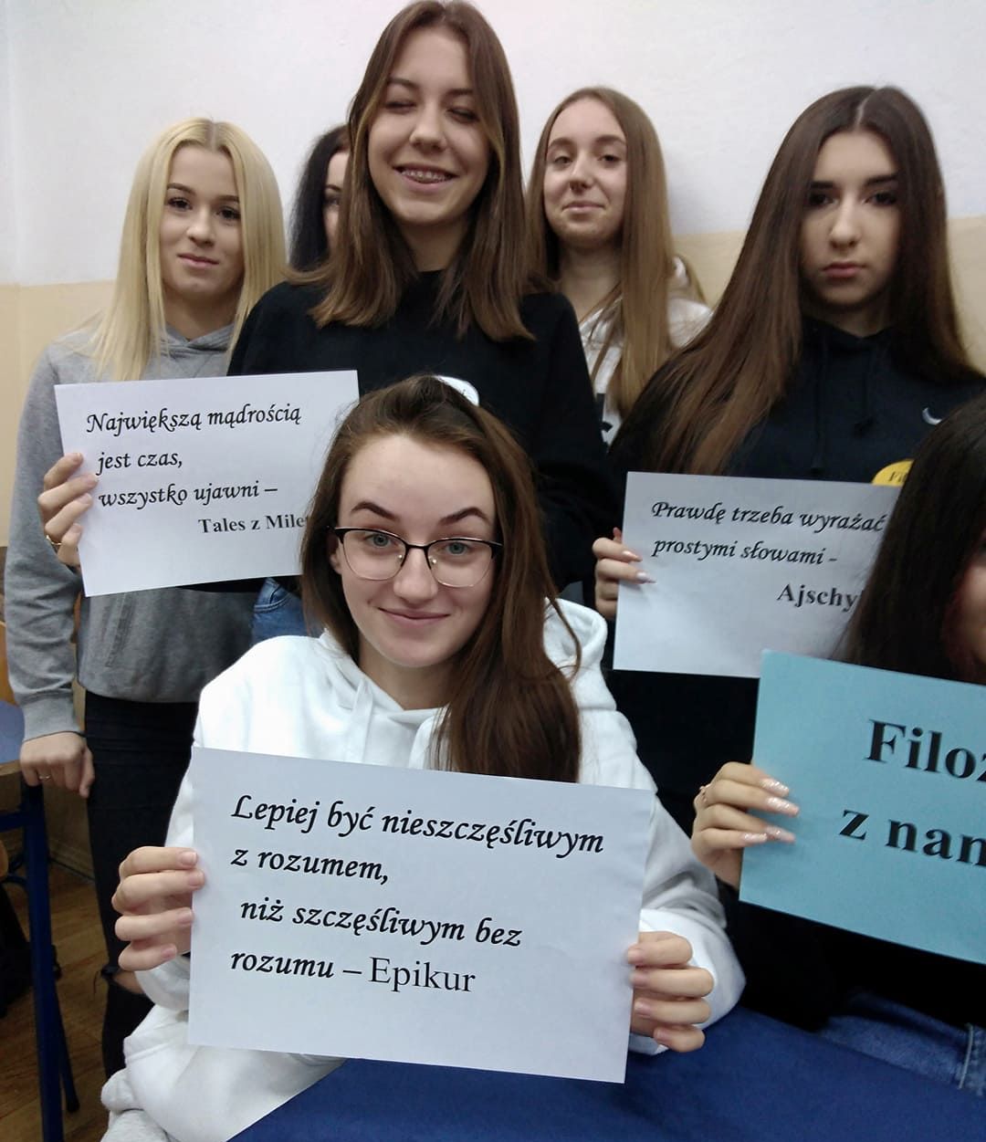 Coroczny Światowy Dzień Filozofii został ustanowiony przez UNESCO w 2002 roku i obchodzony jest w trzeci czwartek listopada. W jego obchody włączyli się uczniowie z klas 1TS, 2TE, 2TH, 2 TMC, 2 TMP i 2 TEL. Na zajęciach poznawali terminy związane z filozofią oraz pytania, na które poszukiwali odpowiedzi filozofowie starożytności. Poznawali też ich myśli i spostrzeżenia. Na koniec zajęć każdy uczeń wylosował dla siebie karteczkę z cytatem filozofa, którego słowa mają wzbudzać refleksję w sposobie postrzegania rzeczywistości i kształtować osobowość człowieka.