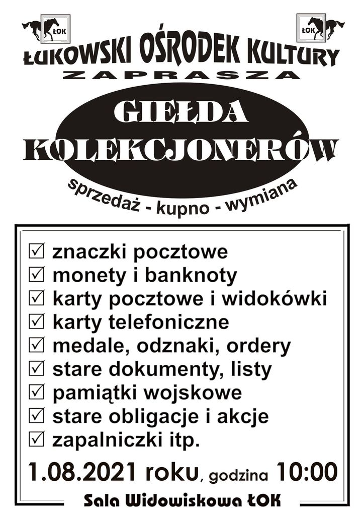 Niedziela 1 sierpnia rozpocznie się od kolejnego spotkania kolekcjonerów. O godzinie 10.00 w Łukowskim Ośrodku Kultury ruszy Giełda Kolekcjonerów.